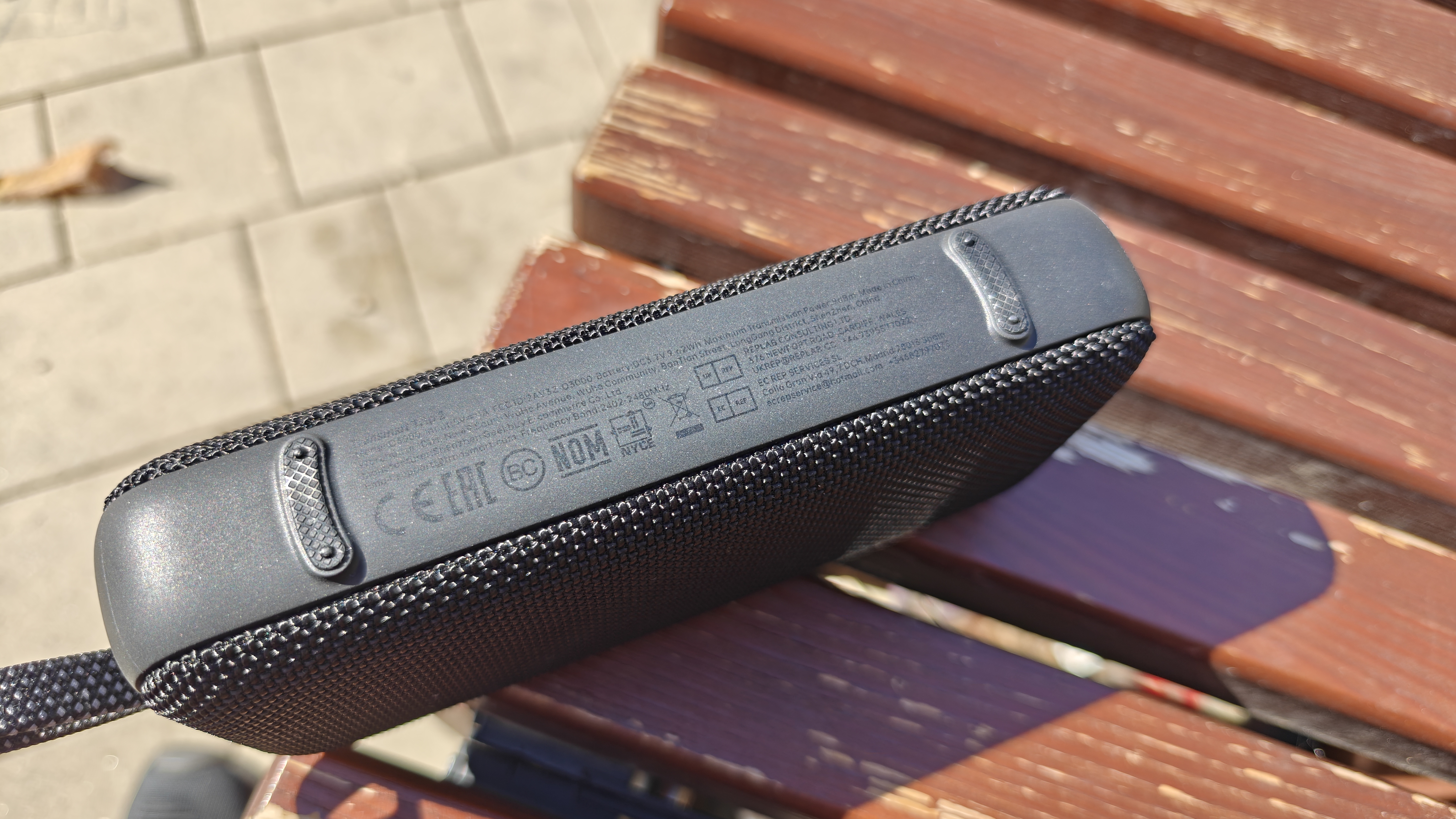 Правый торец, нижнюю сторону и левый торец покрывает прорезиненная накладка со скругленными углами, на нижней части которой заметны выпуклости резиновых ножек и нанесенные параметры модели. Слева выдавлен глянцевый логотип бренда и явно выделяется прочная нейлоновая петля, которая решает больше половины вопросов по перемещению колонки с собой. Справа видна резиновая заглушка отсека с разъемами, на которой выгравировано название модели Trip 2.