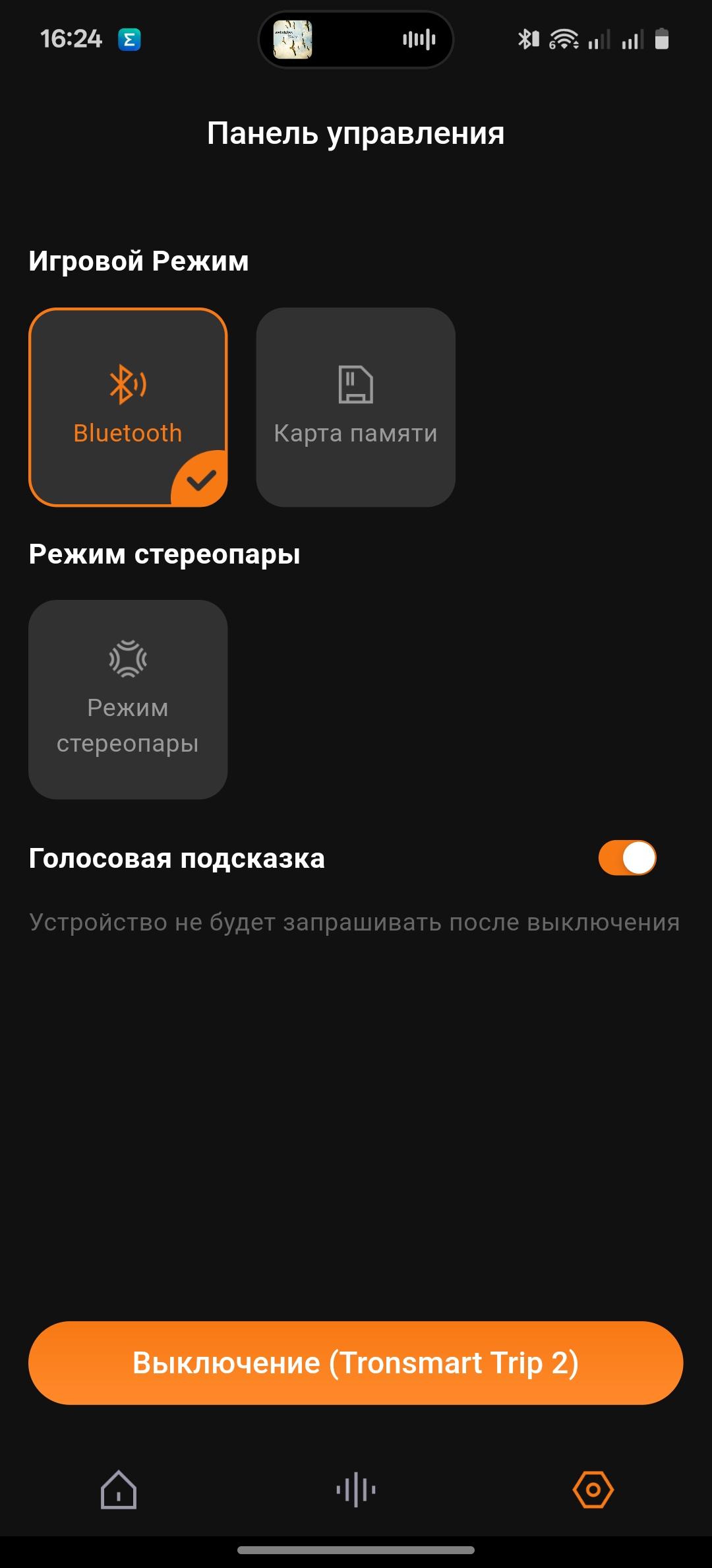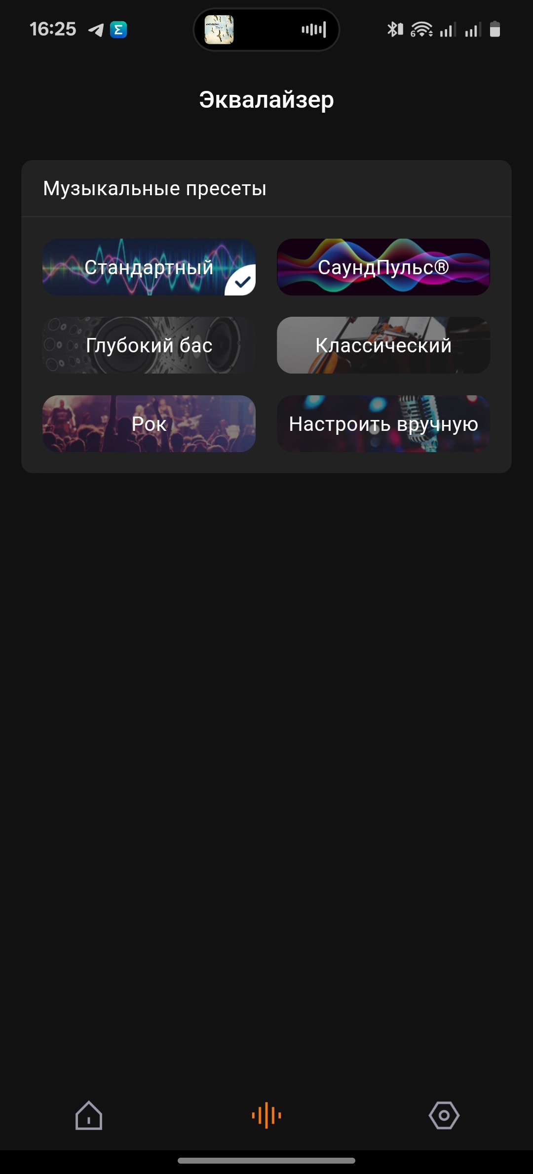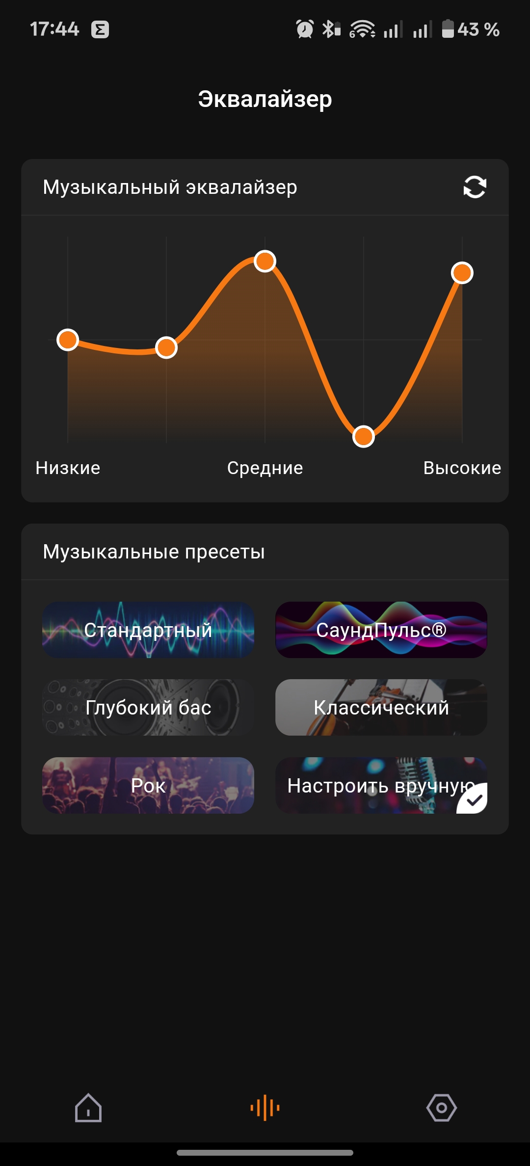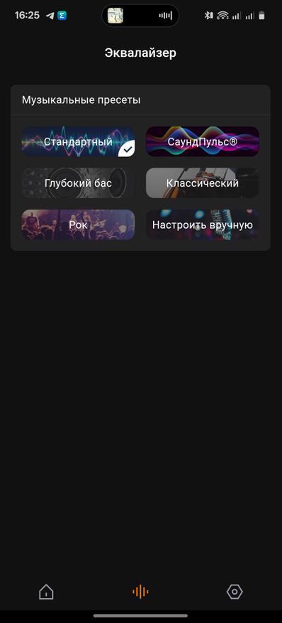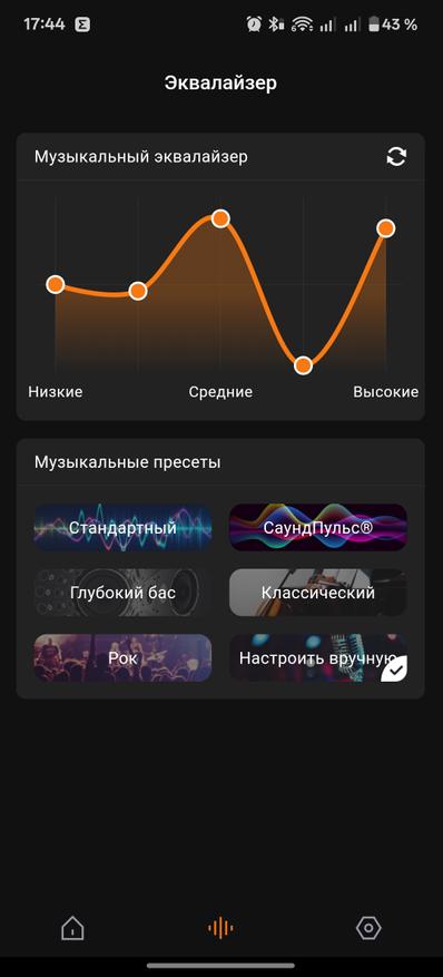Приступаем к использованию. Звучание колонки из коробки опишу как громкое, но чуть с плоскими низкими частотами. Этот нюанс корректируется при использовании специального приложения. Автоматическое подключение добавляет новинку в списке подключенных колонок бренда. В приложении мы можем регулировать громкость, отслеживать заряд, обновлять прошивку колонки, связывать одинаковые колонки в стереопару. В дополнение к общей функциональности есть и регулировка звука. Можно выбрать один из нескольких предустановленных режимов, включая СаундПульс, а также регулировать звучание на кривой вручную.