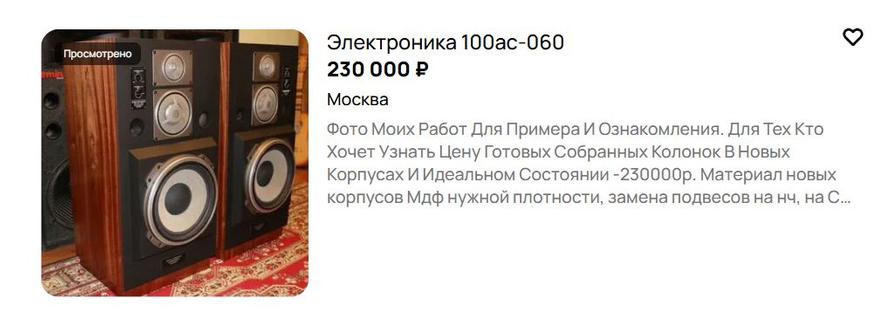 А у цены на этот советский технологичный винтаж несколько оторваны от реальности (~ 200 тыс. руб за восстановленный оригинал и 70-150 тыс. по мотивам с другими динамиками и копанные в хлам):