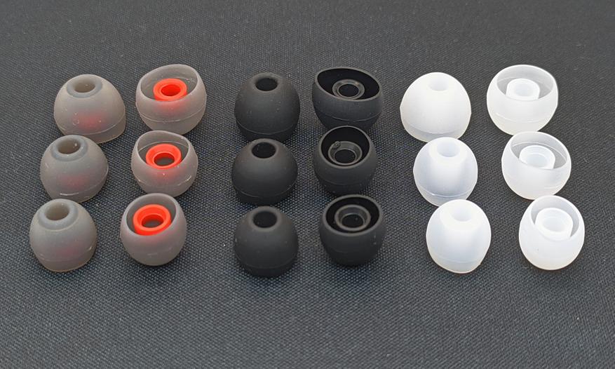 По посадке здесь всё в порядке, ведь корпуса анатомические и дают, как правило, надежную и плотную посадку. Корпуса не сильно крупные, и верхнее крыло не сильно выступает, и мне с моими ушами среднего размера нигде ничего не давило даже на длинных дистанциях. В комплекте у нас три набора силиконовых насадок, почти не отличающихся друг от друга и они полне подходят для удобной посадки.