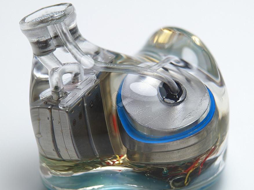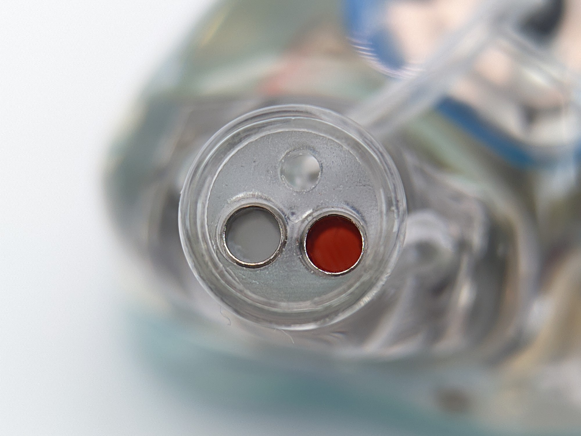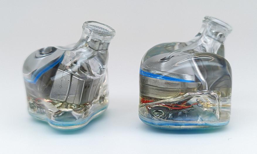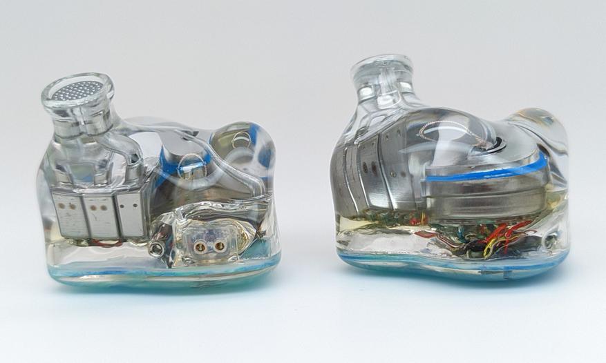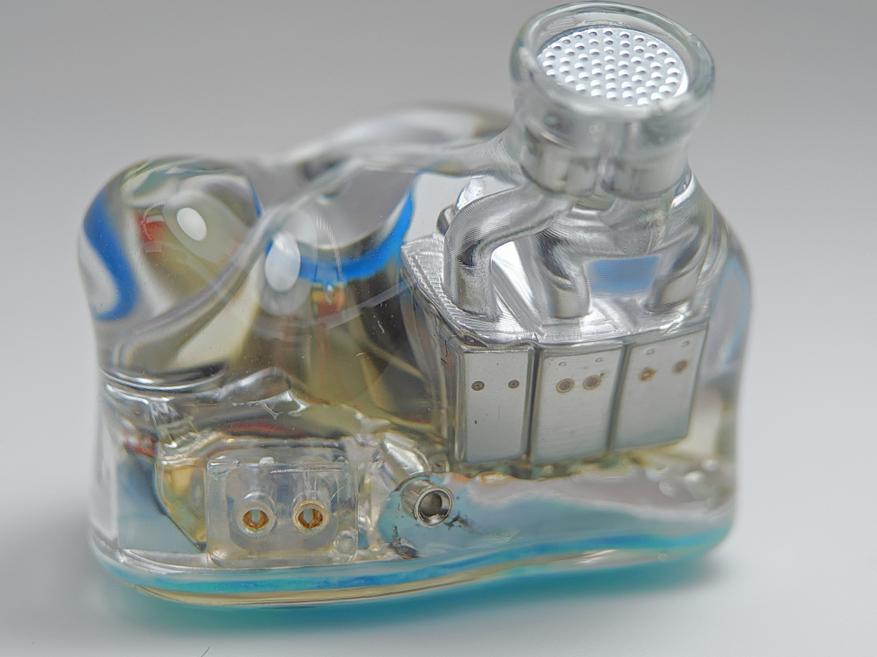 На выходах акустических трубок, идущих от арматурных драйверов, видны демпфирующие акустические фильтры. От трубки динамического драйвера видно ответвление компенсационной трубки для сброса давления, которая выходит в тыльную камеру. Рядом с разъемами подключения кабеля есть выход компенсационного отверстия для этой камеры.