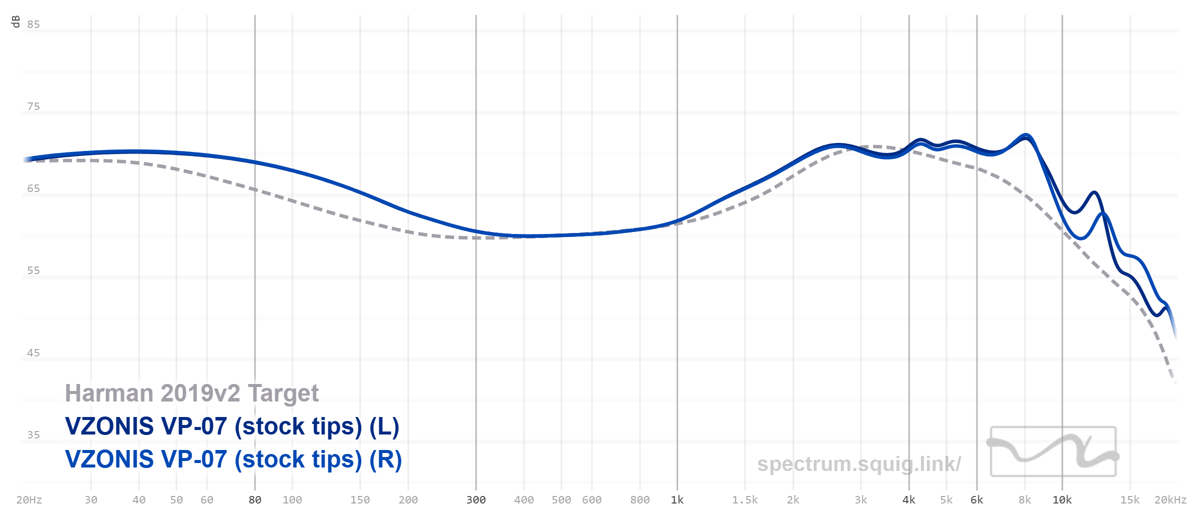 По звучанию у нас очень хорошо выраженная V-шка с массивным и ярким звуком. VP-07 явно ориентированы на усредненную целевую кривую Харман и, в общем, хорошо в нее попадают, но они более драйвовые на низких частотах и чуть более эмоциональные и яркие на высоких частотах. Все это не придает звучанию натуральности, но зато они хорошо динамичные и, если можно так сказать, веселые. Да и сбалансированы они тоже неплохо, потому что звука добавили нам с обеих сторон, и яркие высокие частоты вполне уравновешиваются ударным и плотным басом.