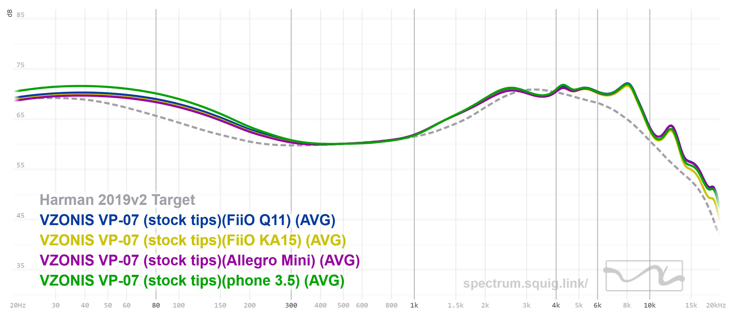 VP-07 несколько требовательны к источнику, и, конечно же, лучше слушать их с ЦАПом. Со смартфоном показывают некоторое усиление низких частот. Но сделал я этот замер только для наглядной реакции наушников на мощность источника. Со смартфоном, конечно, слушать можно, но нужно ли вам это, если значительная прелесть звучания со смартфоном не раскроется. Помимо смартфона и моего настольного ЦАПа FiiO Q11 (165 mW при 32Ω) для сравнения использовал также бюджетный Kiwi Ears Allegro Mini (30 mW при 32Ω) и FiiO KA15 (50 мВт при 32Ω, D-Mode off). И даже с ЦАПами наушники показывают незначительную, но все же разницу.