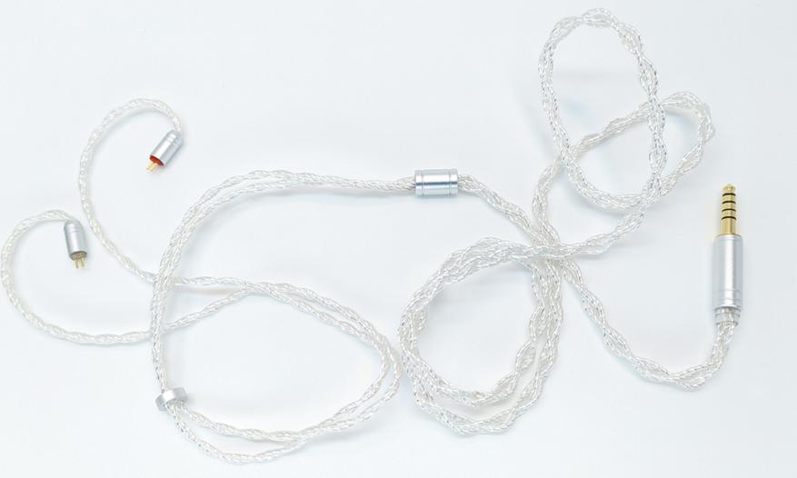 В комплект положили 4-жильный кабель из монокристаллической меди с посеребрением. В каждой жиле по 48 нитей толщиной 0,05 мм. Кабель тактильно приятный, в меру упругий, в меру эластичный. На корпусе балансного джека 4,4 мм есть эластичная защита от перегибов. Полупрозрачный регулятор разветвления живет собственной жизнью и перемещается по кабелю под собственным весом. Длина кабеля 125 см.