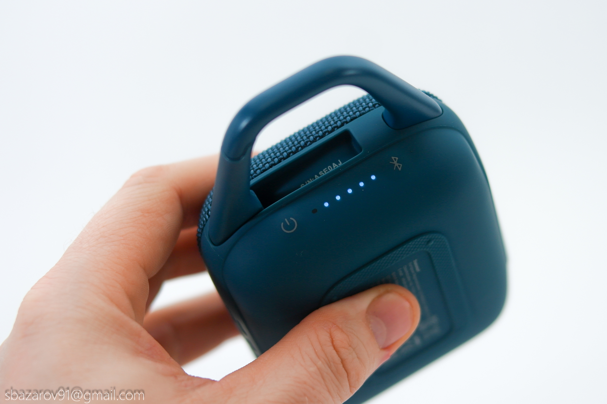 Кнопка включения колонки вынесена на верхнюю грань. Там же есть удобный индикатор заряда, которого так не хватает Bloody S5 и Clip 4. В случае с этими колонками необходимо подключиться к самому устройству и только через софт системы можно узнать об остаточном заряде. В Tronsmart H1 такая мелочь реализована более удобным образом.