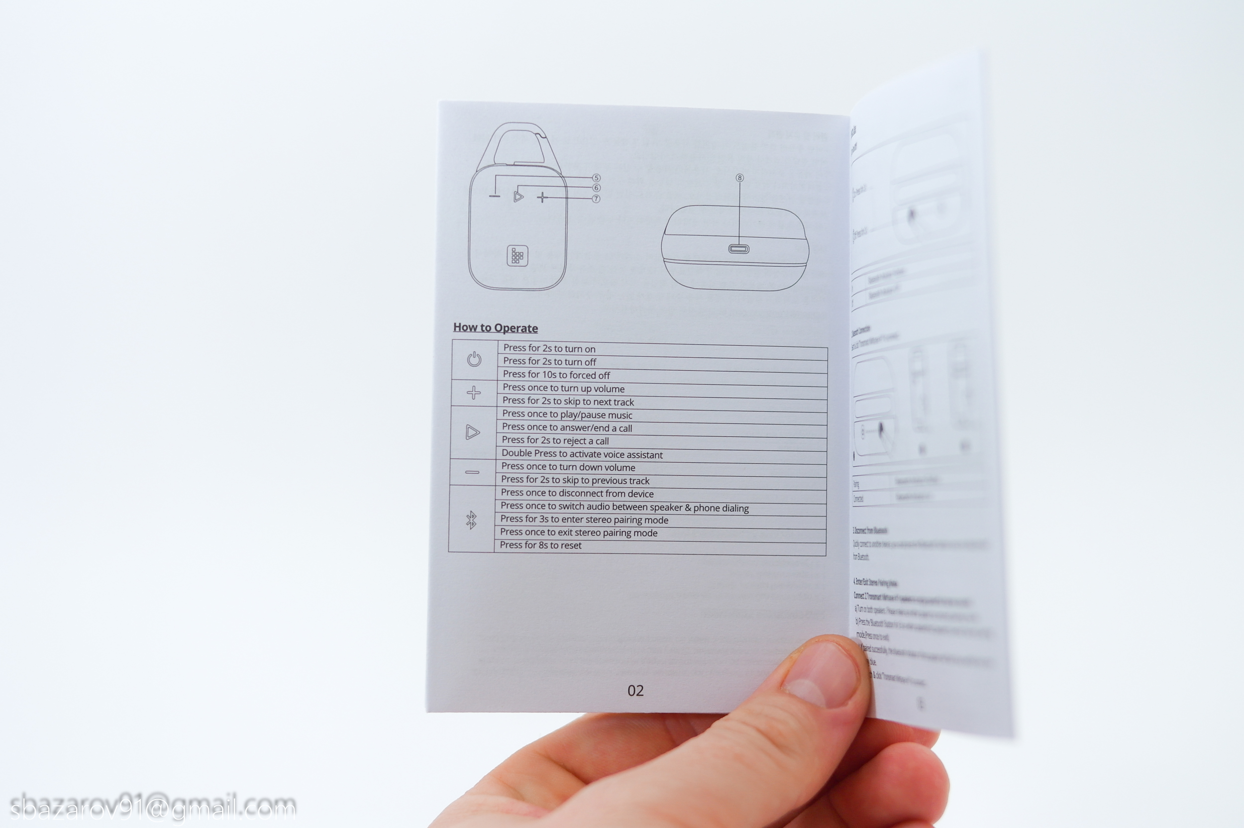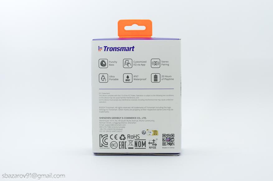 Много лет я не пересекался с продукцией Tronsmart, однако, то, что передо мною их продукция узнается сразу. Все же цветовая гамма и фирменные элементы задают тон, а мозг делают свое дело. Что касается коммерческой упаковки, то она демонстрирует не только внешний вид колонки и её технические характеристики, но и способы применения, а также поддержку защиты IPX7.