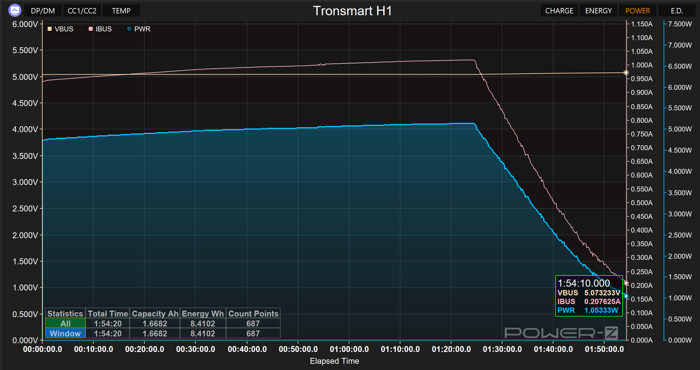 Время на зарядку колонки составляет 1 час 55 минут, а максимальное потребление не переваливает даже за 5Вт (5В/1А). Итоговая ёмкость аккумулятора составила 1668 мА*ч, что немногим более заявленных 2000мА*ч. Как это объяснить? Tronsmart указали ёмкость аккумулятора с напряжением 3,7 Вольта. Если пересчитать ёмкость на 5 Вольт, то она должна составлять 1480 мА*ч ((2000 мА*ч х 3,7 А)/5 В). В моем случае значение 1668 мА*ч превышает заявленное на 11,27%. Вот такая интересная математика.