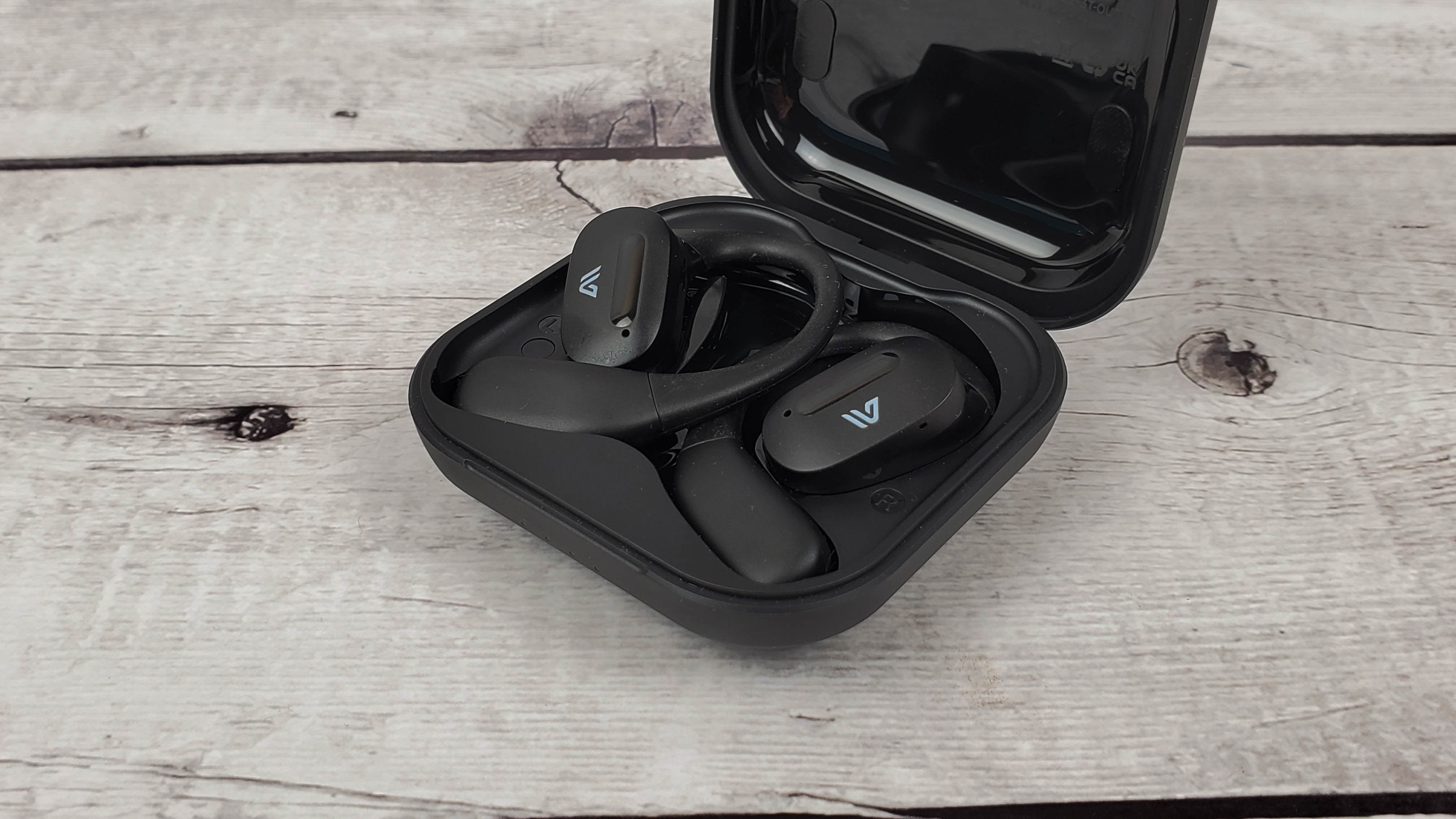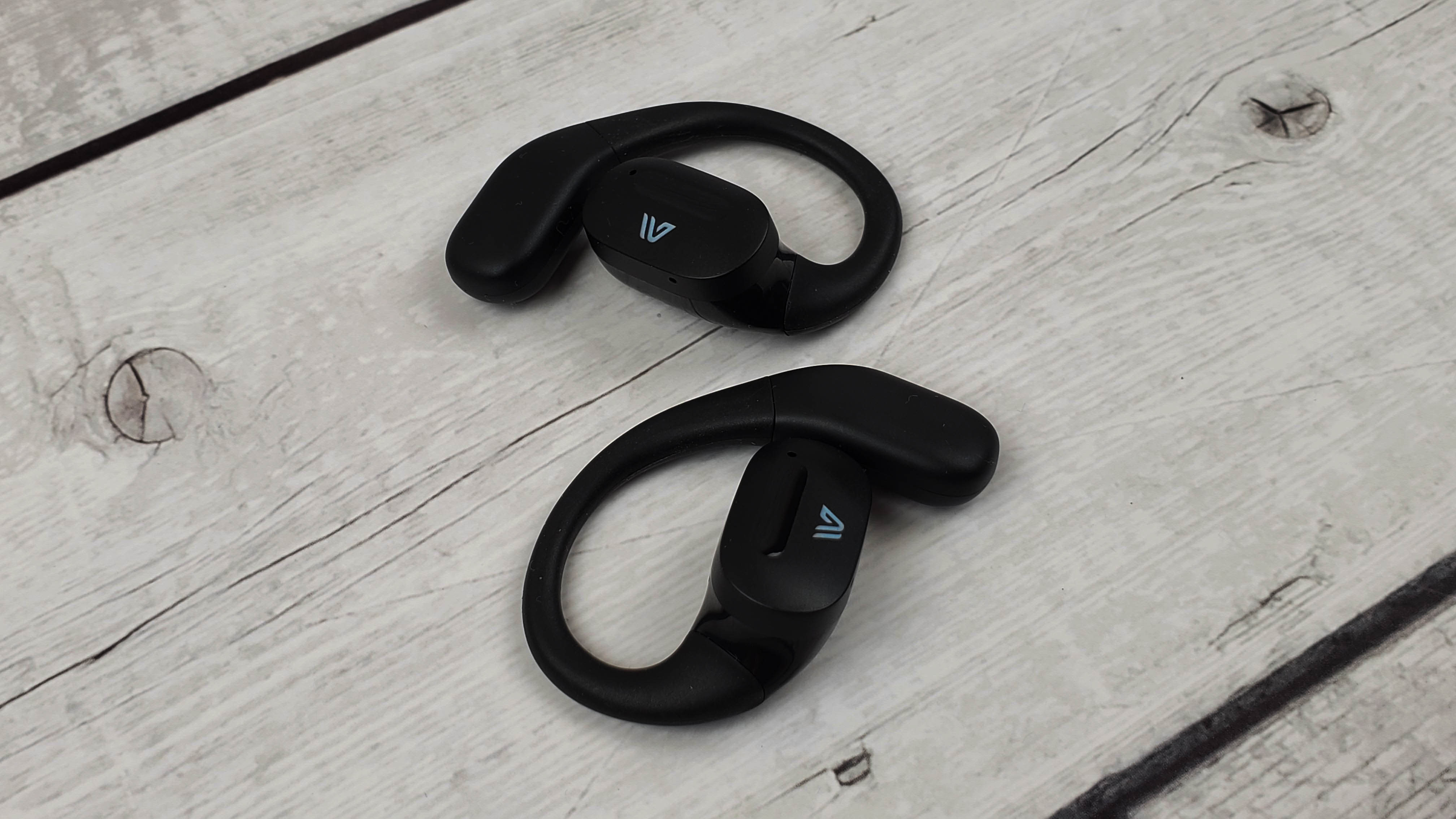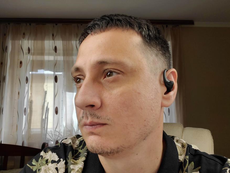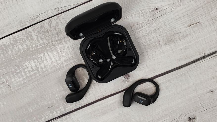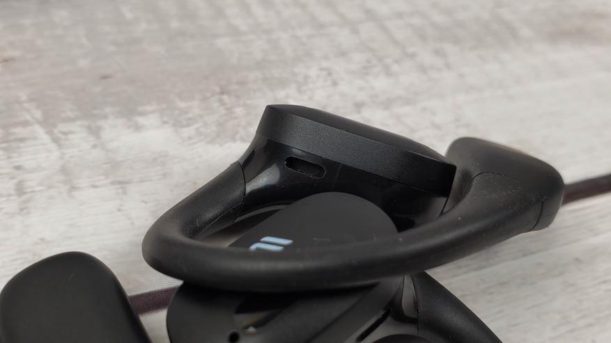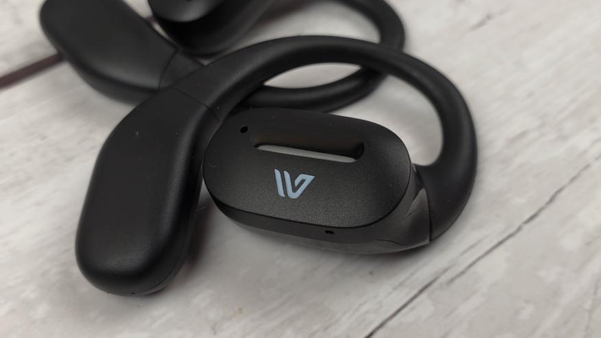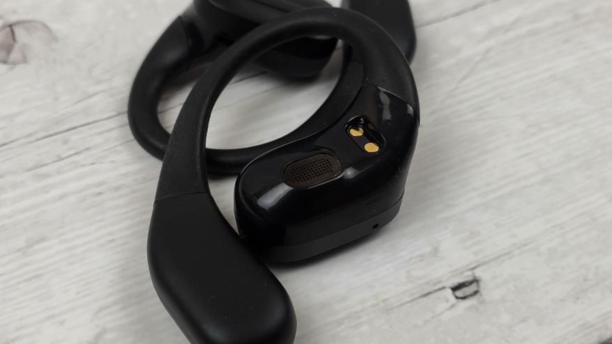 Наушники имеют достаточно крупный корпус, где разместили 15 мм драйвер и аккумулятор, который может обеспечить 5 — 6 часов непрерывного воспроизведения. Заушины гибкие и надежно фиксируют наушники. Можно бегать, прыгать и выполнять активные действия — наушники не спадут.