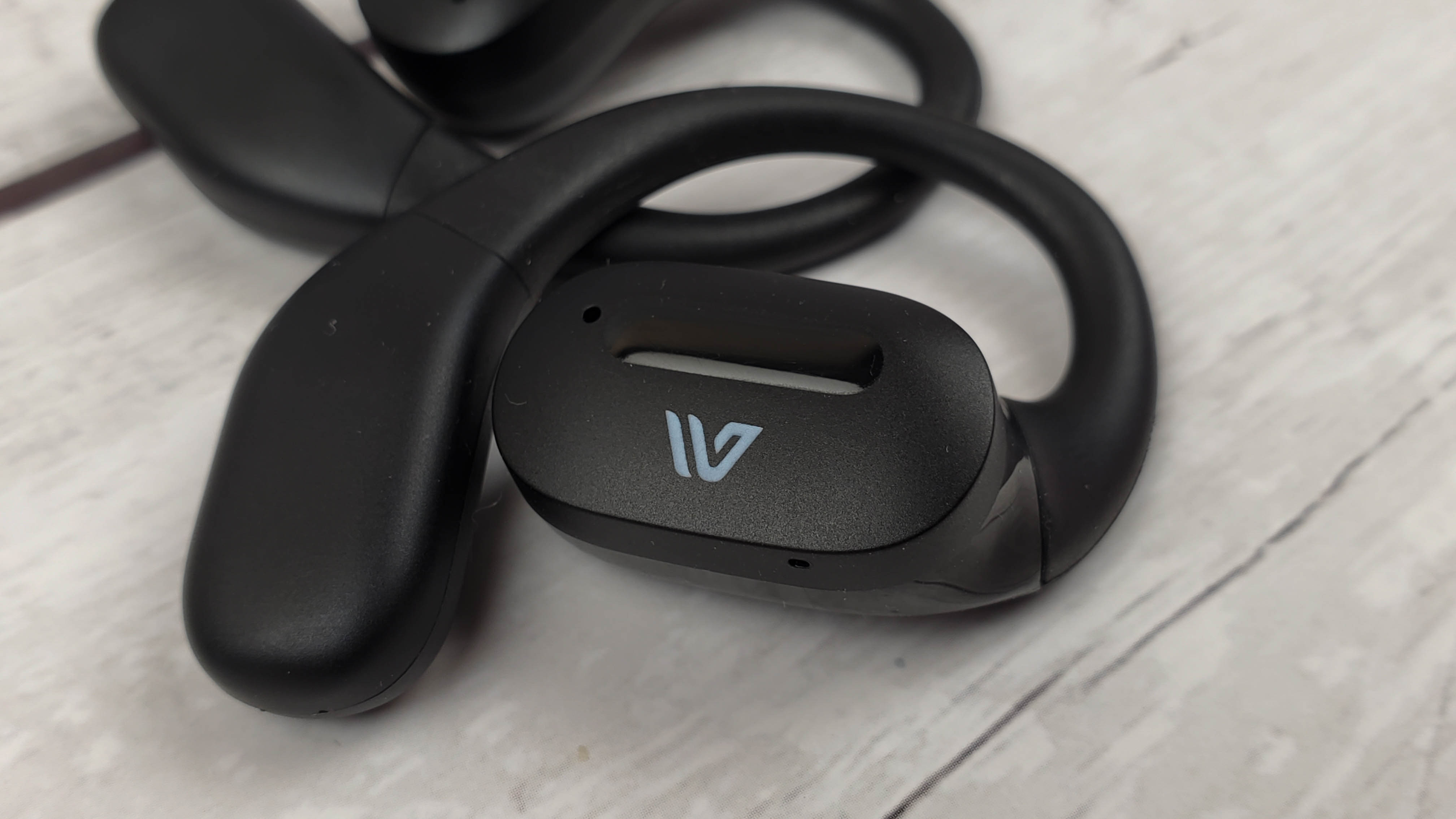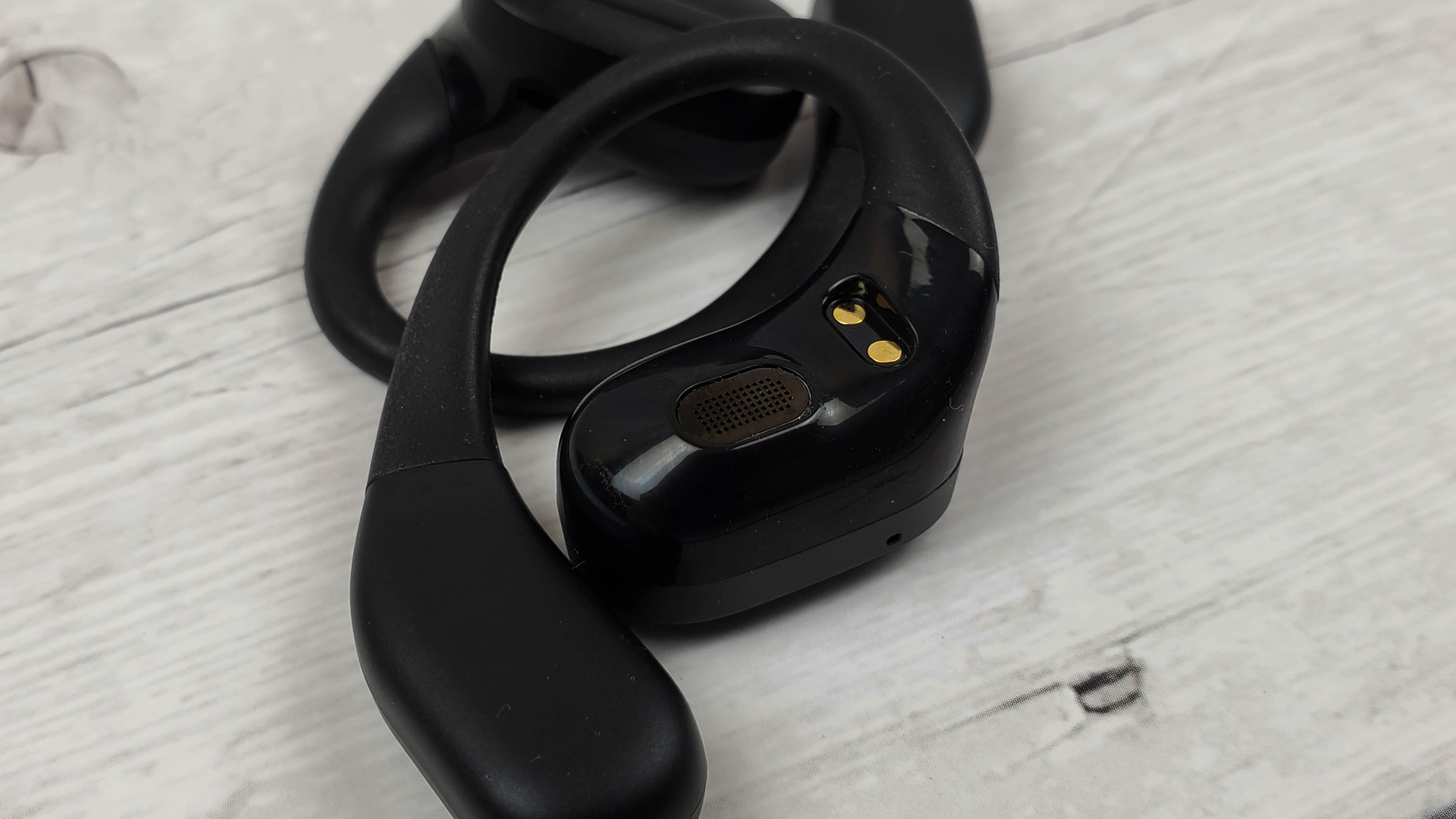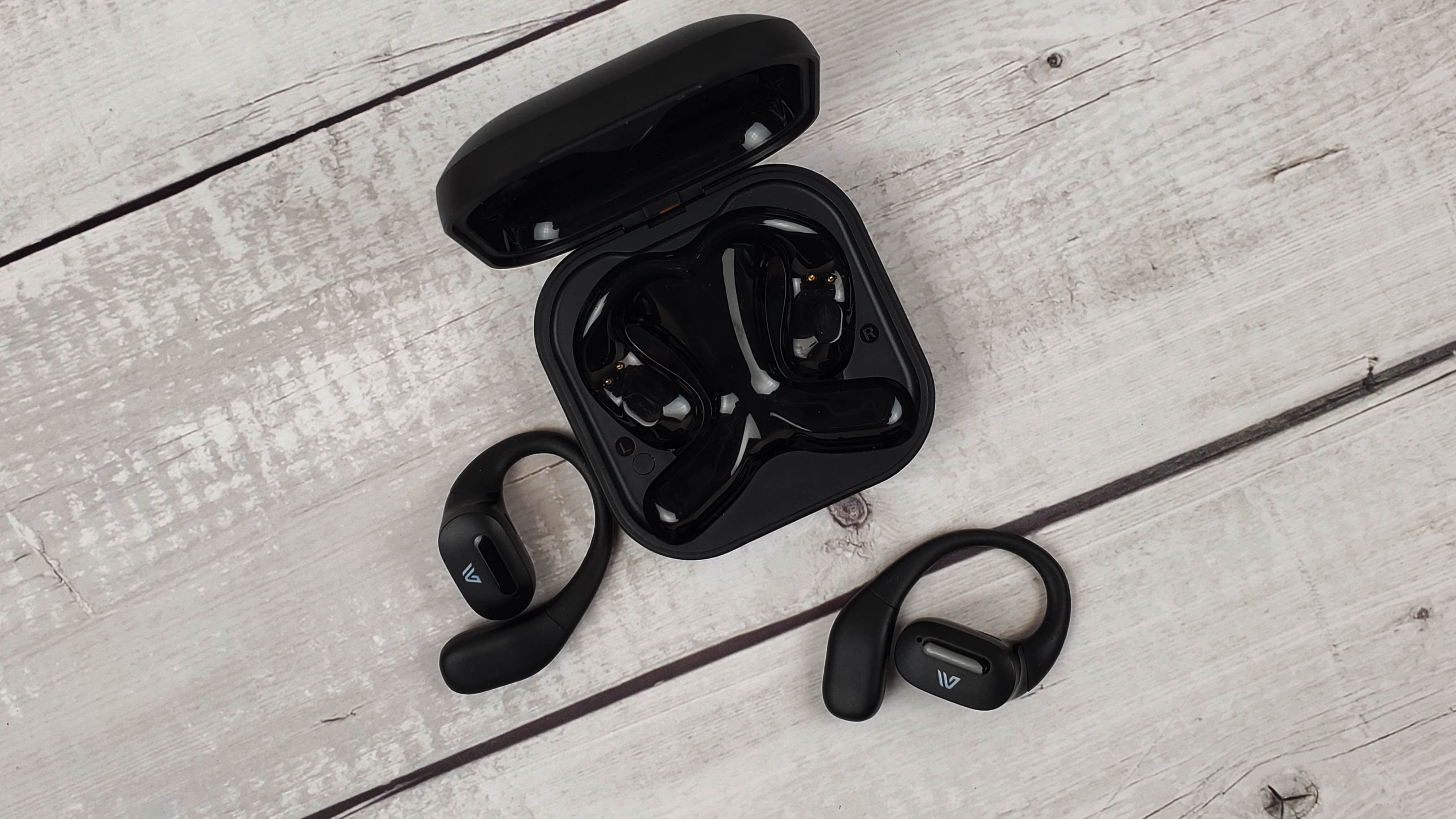 Наушники имеют достаточно крупный корпус, где разместили 15 мм драйвер и аккумулятор, который может обеспечить 5 — 6 часов непрерывного воспроизведения. Заушины гибкие и надежно фиксируют наушники. Можно бегать, прыгать и выполнять активные действия — наушники не спадут.