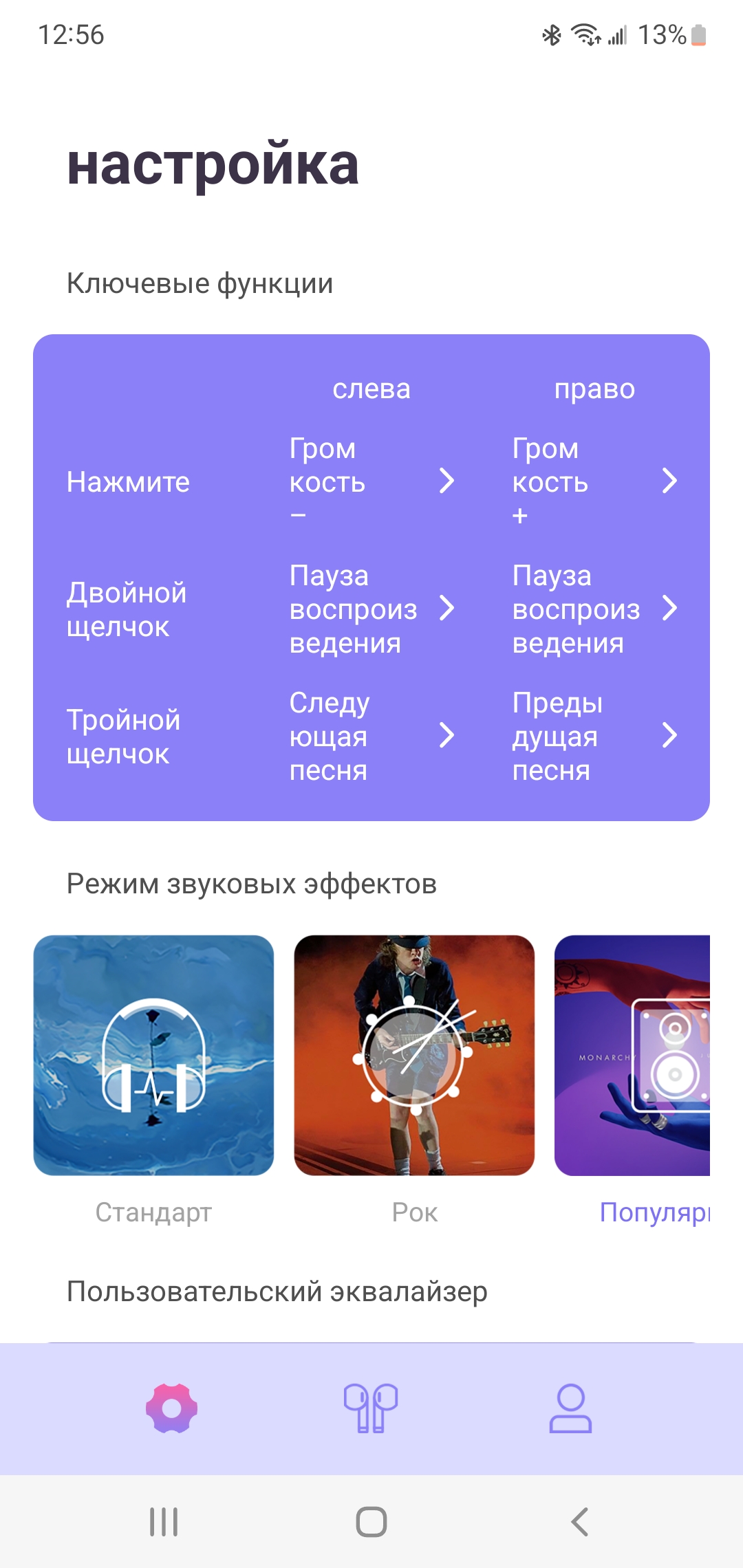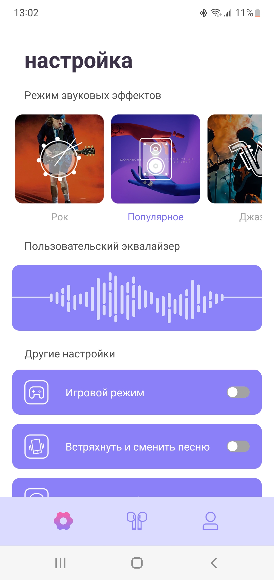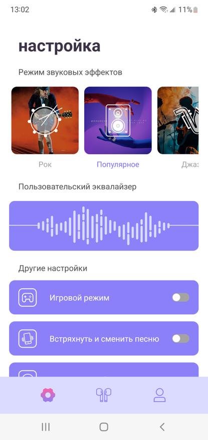 Далее по аналогии с теми же смарт часами мы можем листать экраны или перейти в настройки. Правее от главного экрана расположены предустановленные пресеты эквалайзера. Именно для музыки лучше включить POP, тогда звук становится более сбалансированным и объемным, повышаются низкие частоты. А в режиме стандарт он слишком плоский и имеет выпяченную середину, что, впрочем, хорошо для разговоров и использования наушников в режиме гарнитуры. Не понравилось, что в режиме рок низких частот слишком много и на высокой громкости появляется перегрузка.