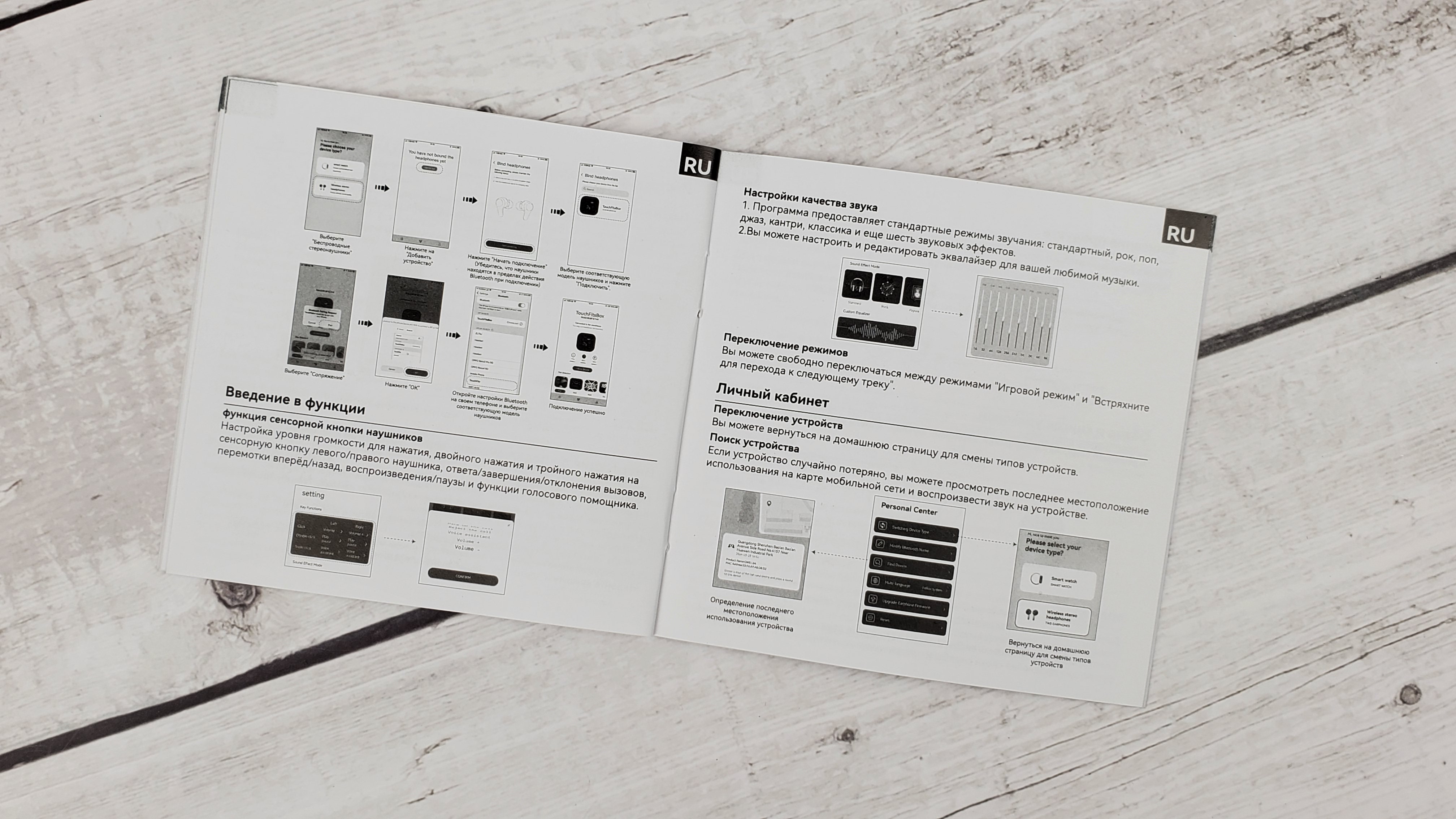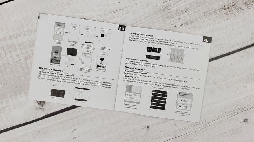 В инструкции присутствует раздел на русском языке, перевод корректный. В инструкции рассказывается как подключить наушники к смартфону, настроить эквалайзер, переназначить управление