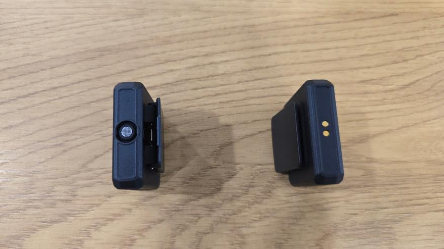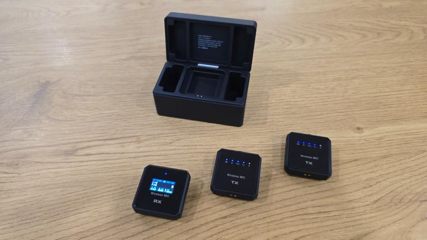 Внутри расположены три отсека, предназначенные для двух передатчиков и приемника. Благодаря встроенным pogo-контактам зарядка устройств становится простой — достаточно просто разместить элементы в их отсеках.