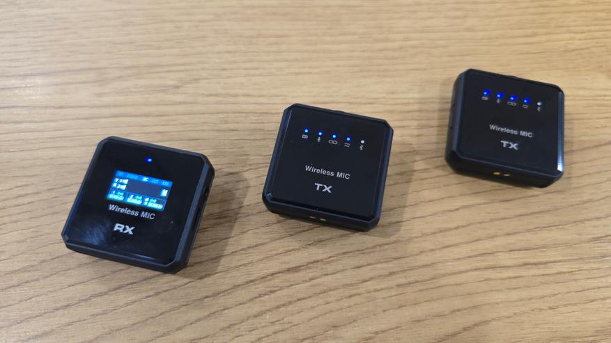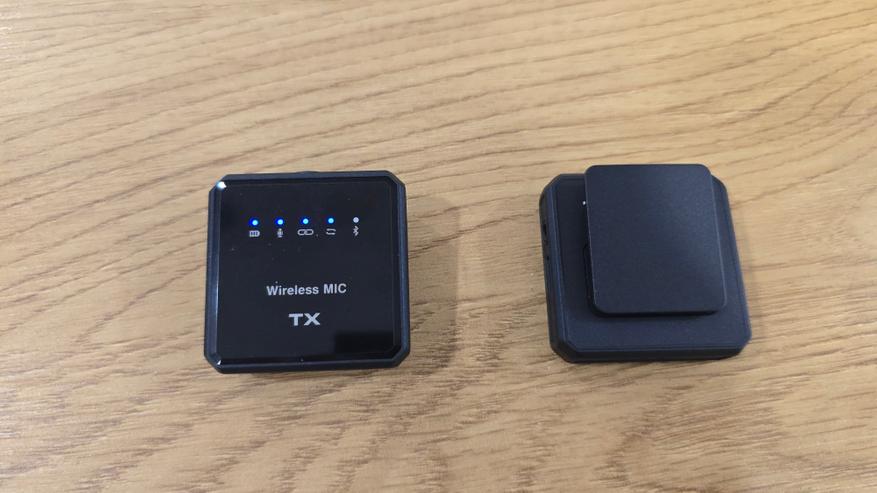 Начнем с передатчиков. Они в меру компактны и легки, что позволяет без труда крепить их на одежду. Передняя поверхность гладкая, но при этом лаконичная: здесь расположены светодиодные индикаторы, которые информируют о режиме работы и уровне заряда.