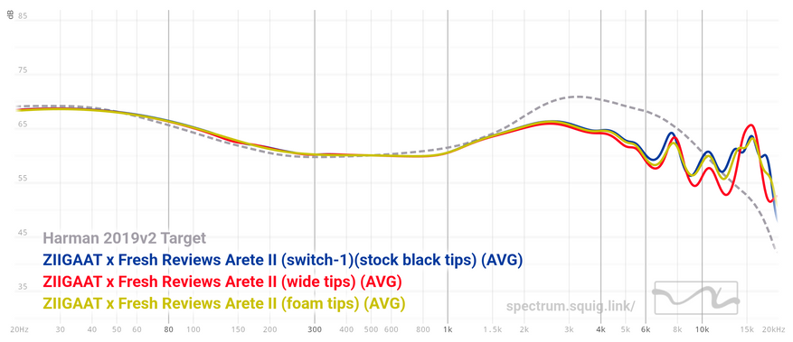 На смену насадок на замерах Arete II показали адекватную реакцию, но в реальных условиях из-за особенностей анатомии это, конечно же, может отличаться. В замерах я использовал насадки из комплектного набора темных силиконовых (с прозрачными они почти одинаковые по форме), пенные и сторонние с широкими звуководами. Как обычно, пенные чуть сдерживают высокие частоты, а комплектные со сторонними показали почти идентичные результаты. Обычно насадками с широким звуководом можно чуть расширить пространство. Arete II и так звучат достаточно объемно, но такими насадками объем еще можно чуть увеличить. И в реальном использовании именно это чуть-чуть, но произошло относительно комплектных.