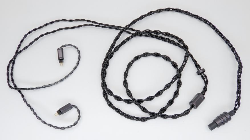 Комплектный кабель чуть тоньше средней толщины, немного тонковат и склонен к запутыванию. Зато легкий и эластичный, и пользоваться таким удобнее, чем толстыми, которые как канат раскачиваются при любом движении головы. Заявлено, что провода у него из меди высокой очистки с посеребрением. Есть у кабеля кольцо регулировки разветвления, которое туговато скользит, но зато надежно фиксируется. Также на корпусе модуля для подключения сменных джеков есть эластичная защита от перегибов.