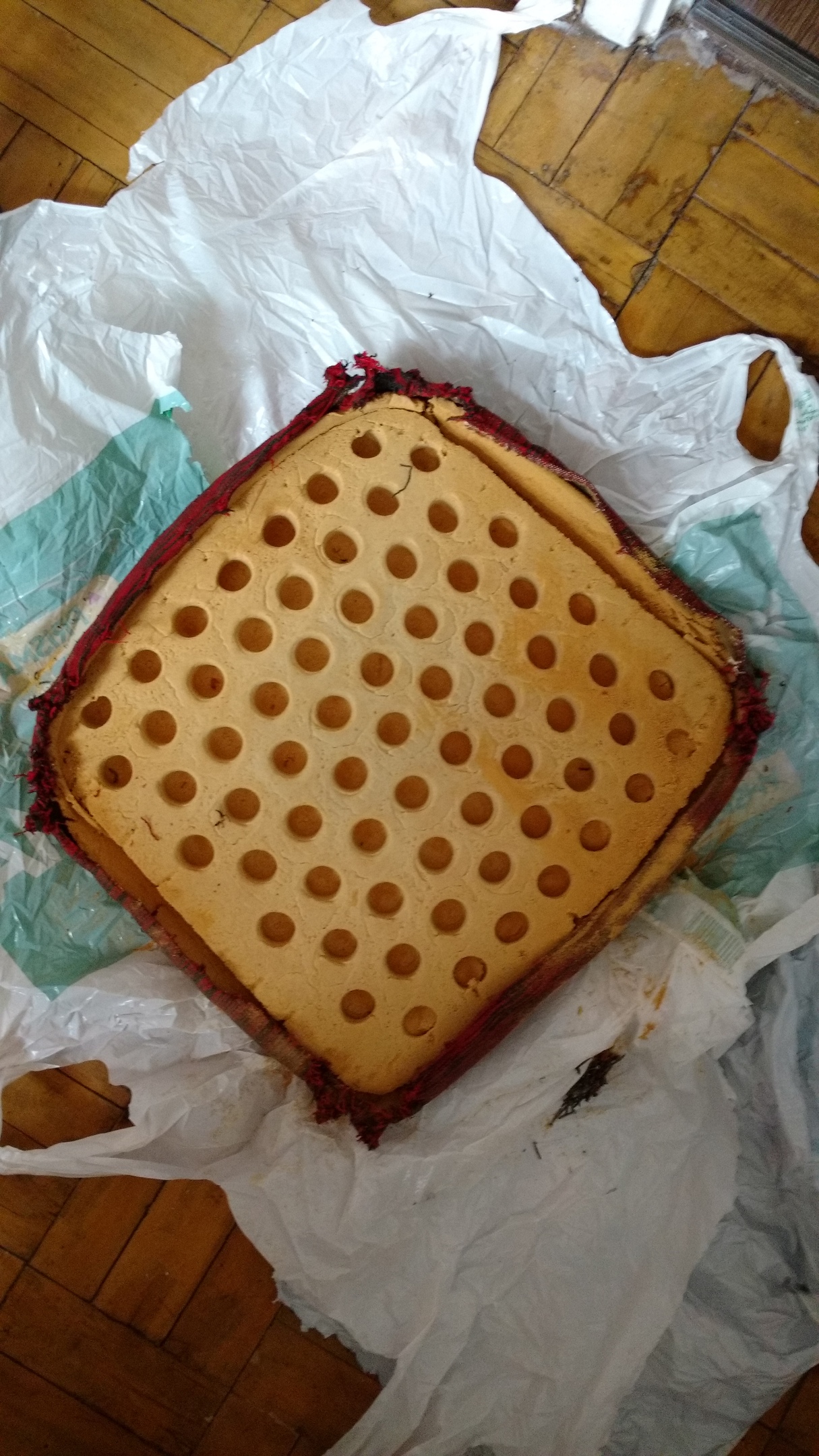 - Разложите новую ткань лицевой стороной вниз на чистое место, разместите сверху поролон, затем сиденье. Берите ткань с небольшим запасом, всегда проще отрезать лишнее, а вот приделать дополнительное будет сложно. Чтобы ткань плотнее прилегала к сиденью и поролону, может потребоваться налечь на сиденье всем весом. Можно приложить поролон, сиденье и встать коленками на сиденье.