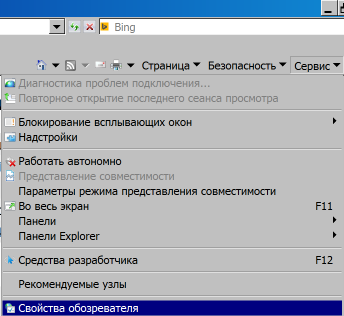 К сожалению, в Internet Explorer нельзя удалить куки только для определенного сайта. Поэтому приготовьтесь к тому, что вам придется вводить пароли заново на всех сайтах! Выберите меню «Сервис» в правом верхнем углу, в нем пункт «Свойства обозревателя».