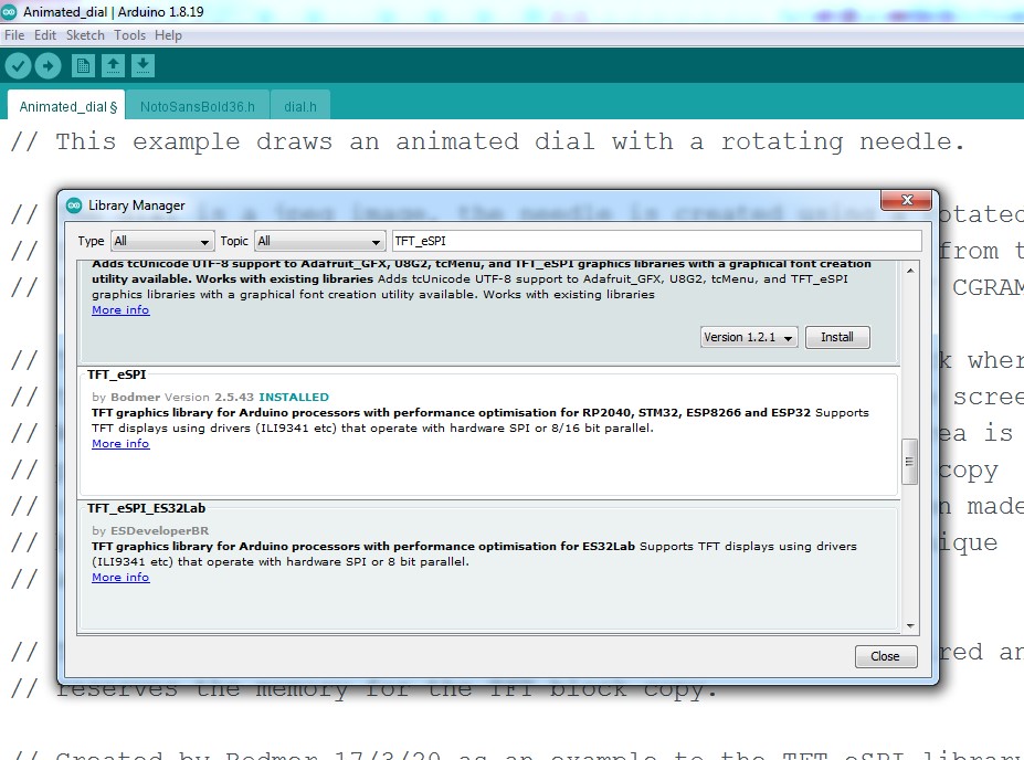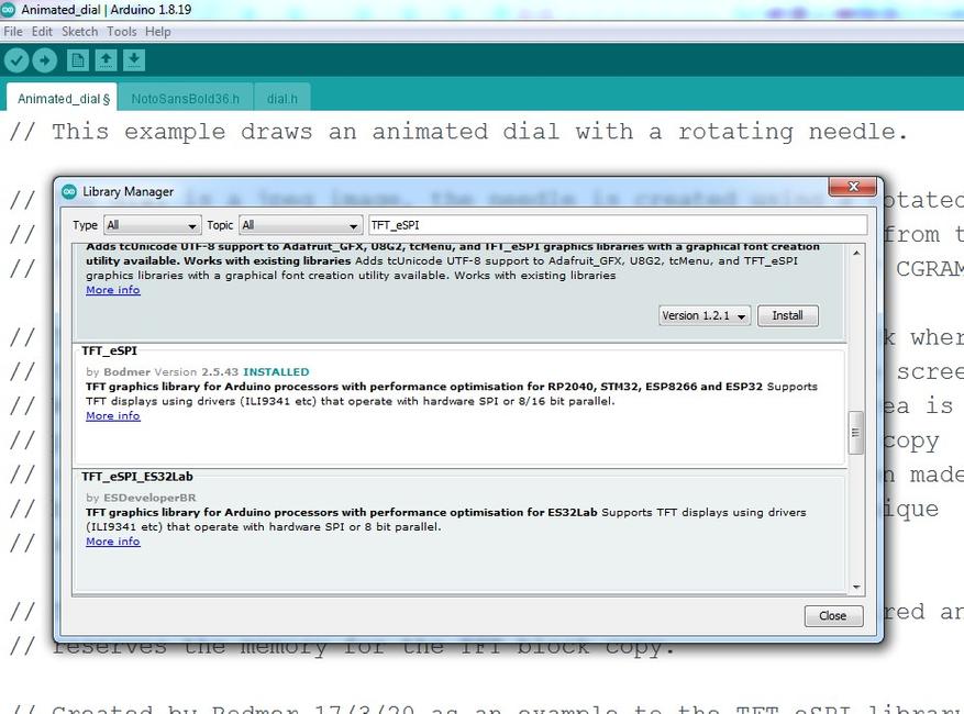 Для проверки дисплея берем контроллер ESP32. Для работы можно воспользоваться библиотекой TFT_eSPI. Для этого в Aduino IDE выбрать меню Tools -> manage Libraries, потом в строчке поиска ввести «TFT_eSPI», а в появившемся списке найти TFT_eSPI by Bodmer и нажать install.