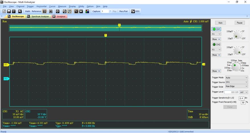 Увеличил развертку до 10 миллисекунд и получил результаты, так же сильно не отличающиеся от предыдущих. Максимум 18 миллиВольт!!!
