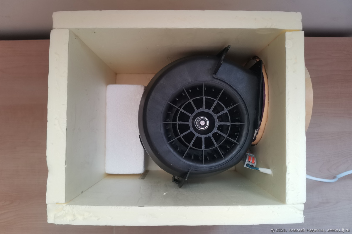 Используется 24-вольтовый вентилятор отопителя 04-8710 КЭП 42.3780 для автомобиля МАЗ, стоимостью 1440 рублей. Он питается от регулируемого источника питания за 400 руб. При штатном напряжении 24 В этот вентилятор «орёт, как слон» и дует со страшной силой. Для получения необходимого потока воздуха при минимальном уровне шума на него подаётся напряжение от 4 до 8 вольт.