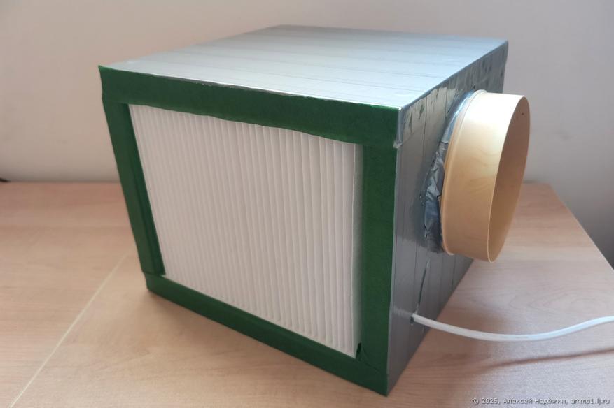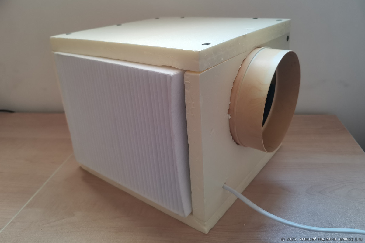 Корпус сделан из XPS (один из его видов — «Пеноплекс»), толщиной 20 мм. Детали нужного размера вырезаются обычным хозяйственны ножом. Корпус собирается с помощью длинных (30 или 35 мм) чёрных саморезов по гипсокартону. Размер корпуса сделан таким, чтобы фильтр (175x240 мм) плотно вставлялся вместо одной из стенок.