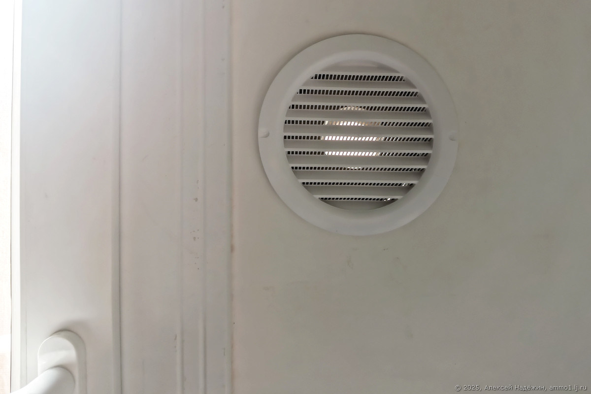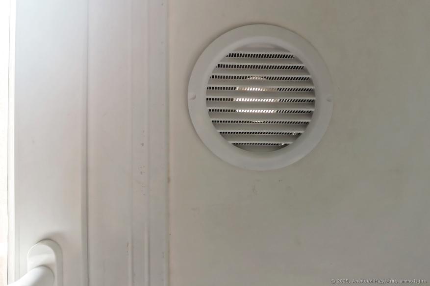 Со стороны комнаты лишь декоративная решётка, направляющая воздушный поток. Видно суженное отверстие дополнительного шумогасителя.