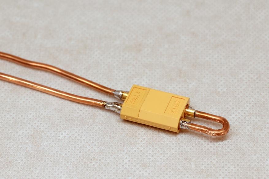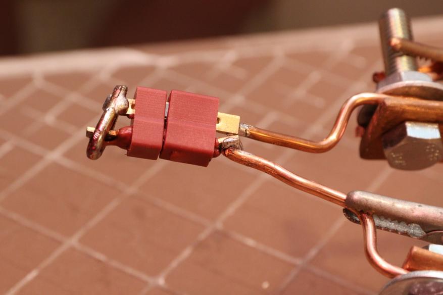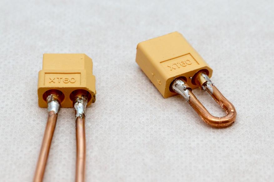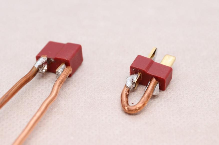 Припаял к обоим медный провод 6 мм2. Надо заметить, что XT60 паять намного проще, т.к. провод удобно размещается в трубке контакта, куда можно вдоволь налить припоя. Провод в 6 квадратов влезает только-только, в зазор припой бодро затекает, влекомый капиллярными силами.
