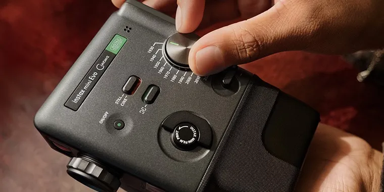 Ключевой особенностью Instax Mini Evo Cinema стал переключатель Eras Dial, расположенный на боковой панели. Этот механический селектор предлагает набор визуальных пресетов, имитирующих эстетику разных десятилетий — от 1930-х до 2020-х годов. Среди доступных эффектов — имитация 8-миллиметровой киноплёнки в стиле 1960-х и эффект ЭЛТ-телевизора для воссоздания атмосферы 1970-х.