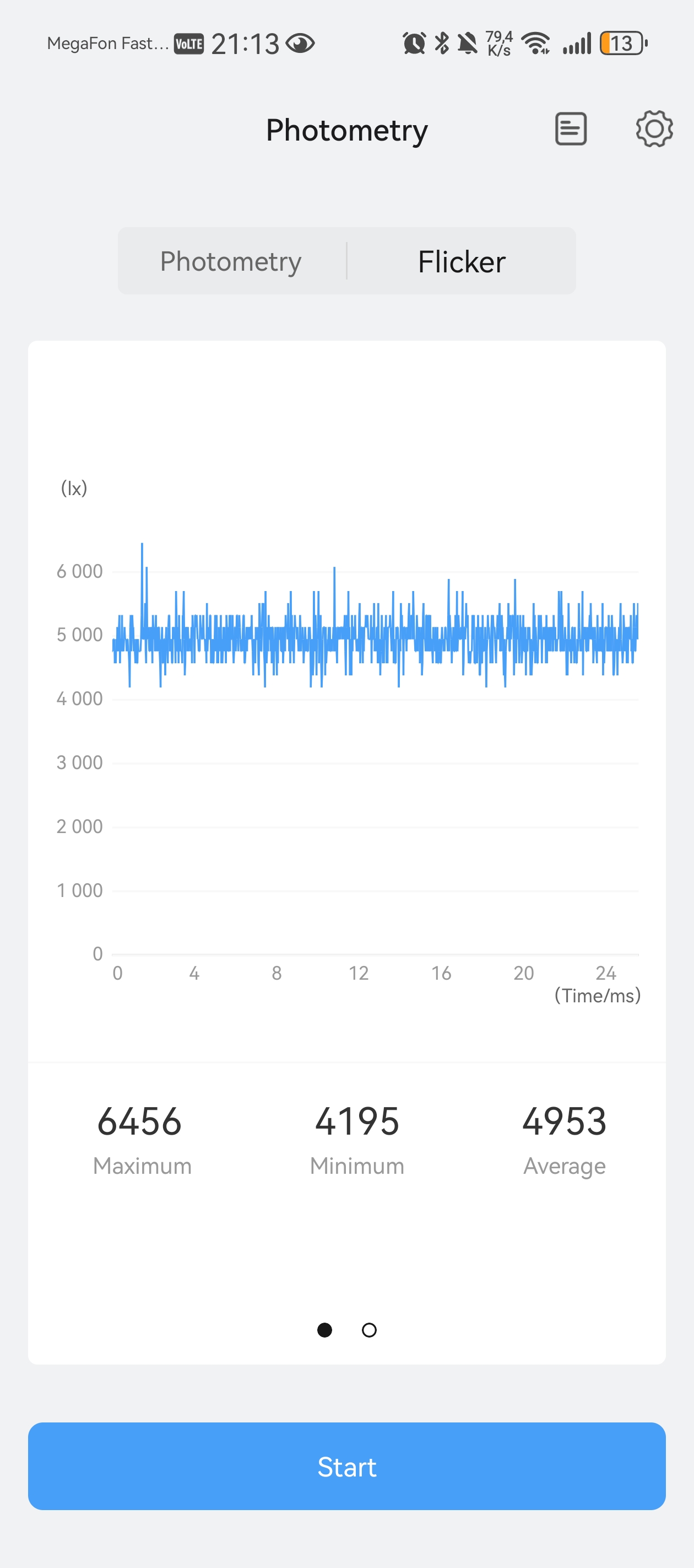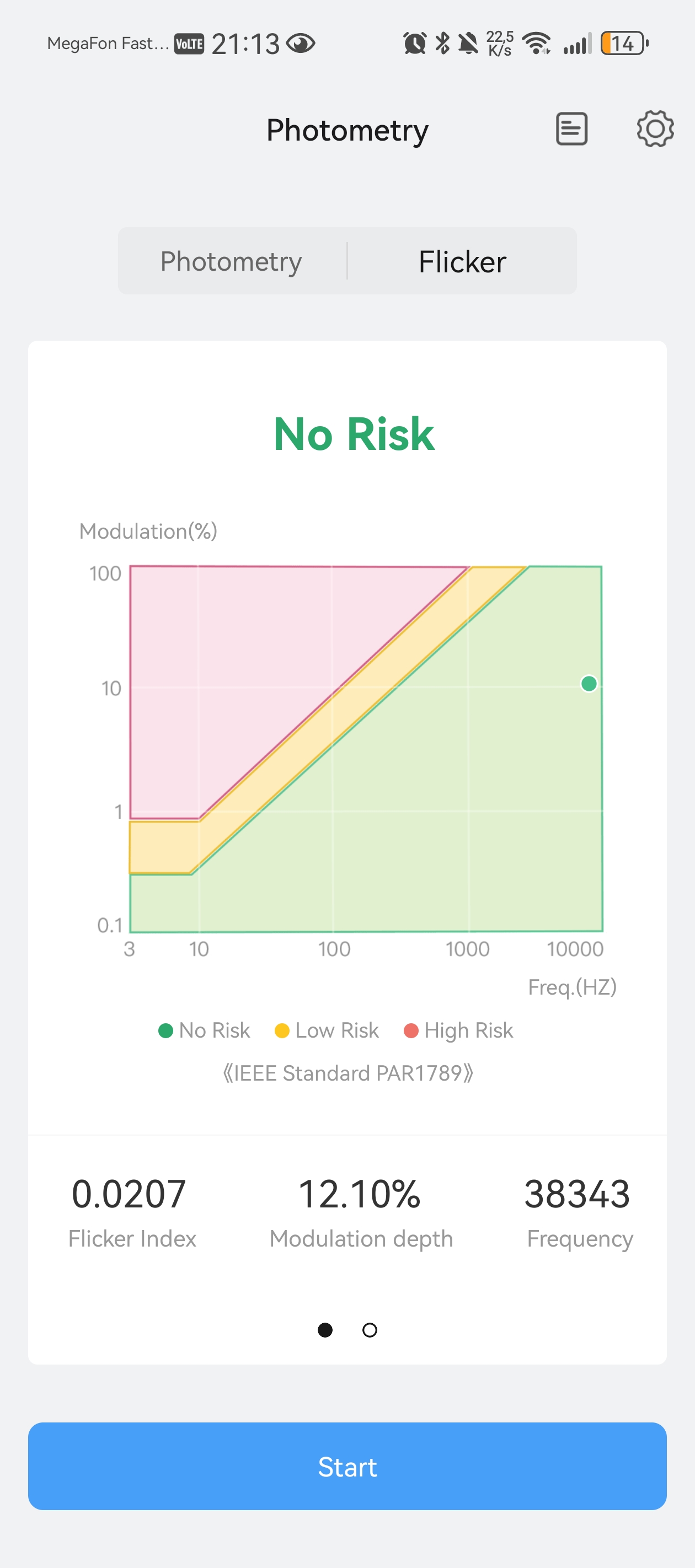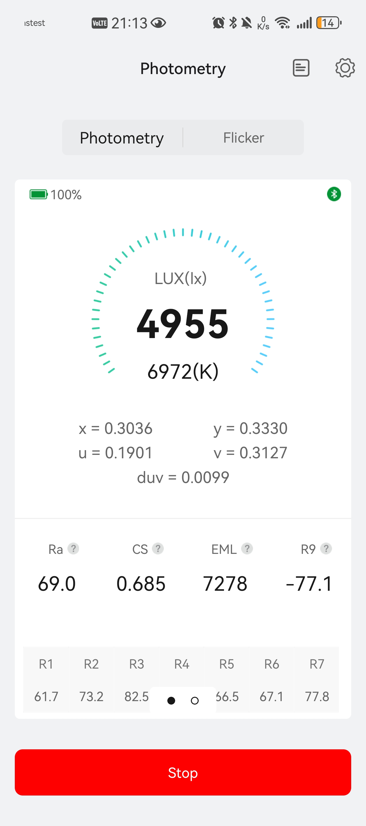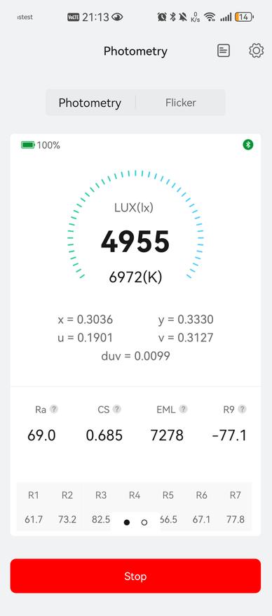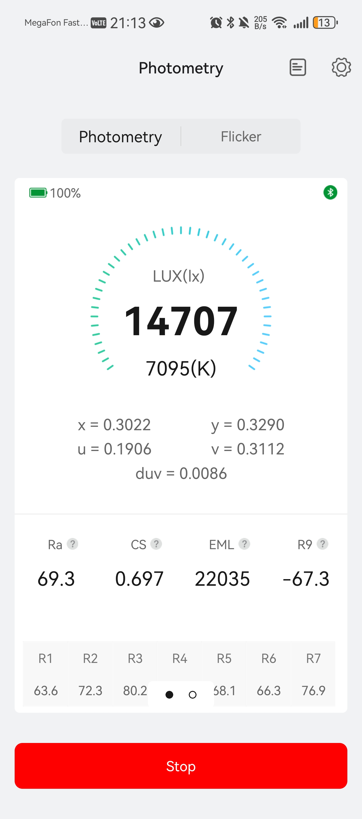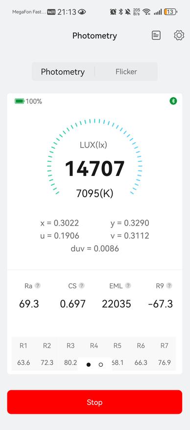 Ниже привел оценки первого (слабого) режима свечения. Оценка делалась при помощи Opple Light Meter 4. Освещенность оценена в 5000Лк, цветовая температура — 7000К в первом режиме.