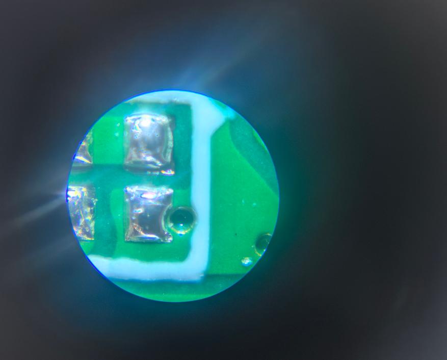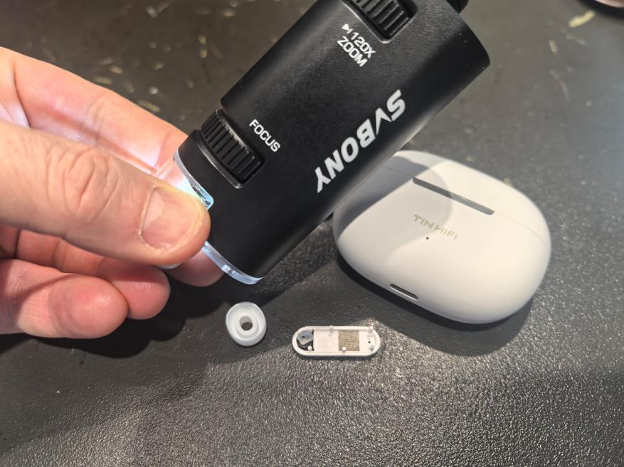 Плата наушника TinHiFi TinBuds1 (обзор здесь). Кадр сделан на минимальном приближении, так как для второго нужна была устойчивая поверхность, которую не получилось «организовать» быстро. Полученного изображения вполне хватает как для визуальной инспекции, так и для каких-то дальнейших действий по пайке, если они будут необходимы. Имею в виду, что как минимум можно увидеть, какую сторону ещё можно допаять было бы.