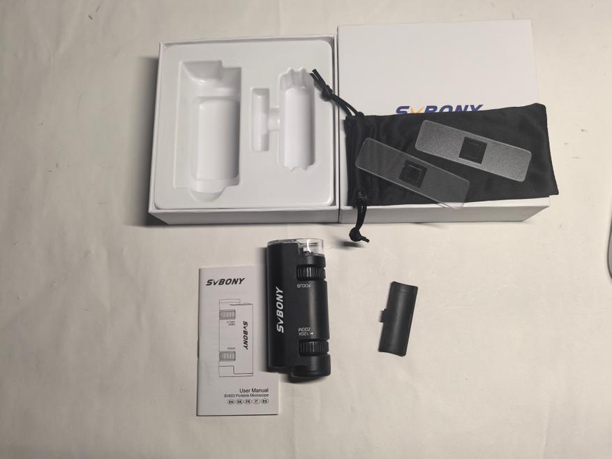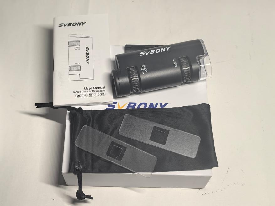 В комплект входит модель SV603, мешок для переноски, две пластмассовые пластины и инструкция. На пластины можно положить исследуемые предметы и смотреть на них через микроскоп. Она имеет углубление, поэтому объект надо прикрывать такой пластиной и наблюдать его в мелких деталях через товар.