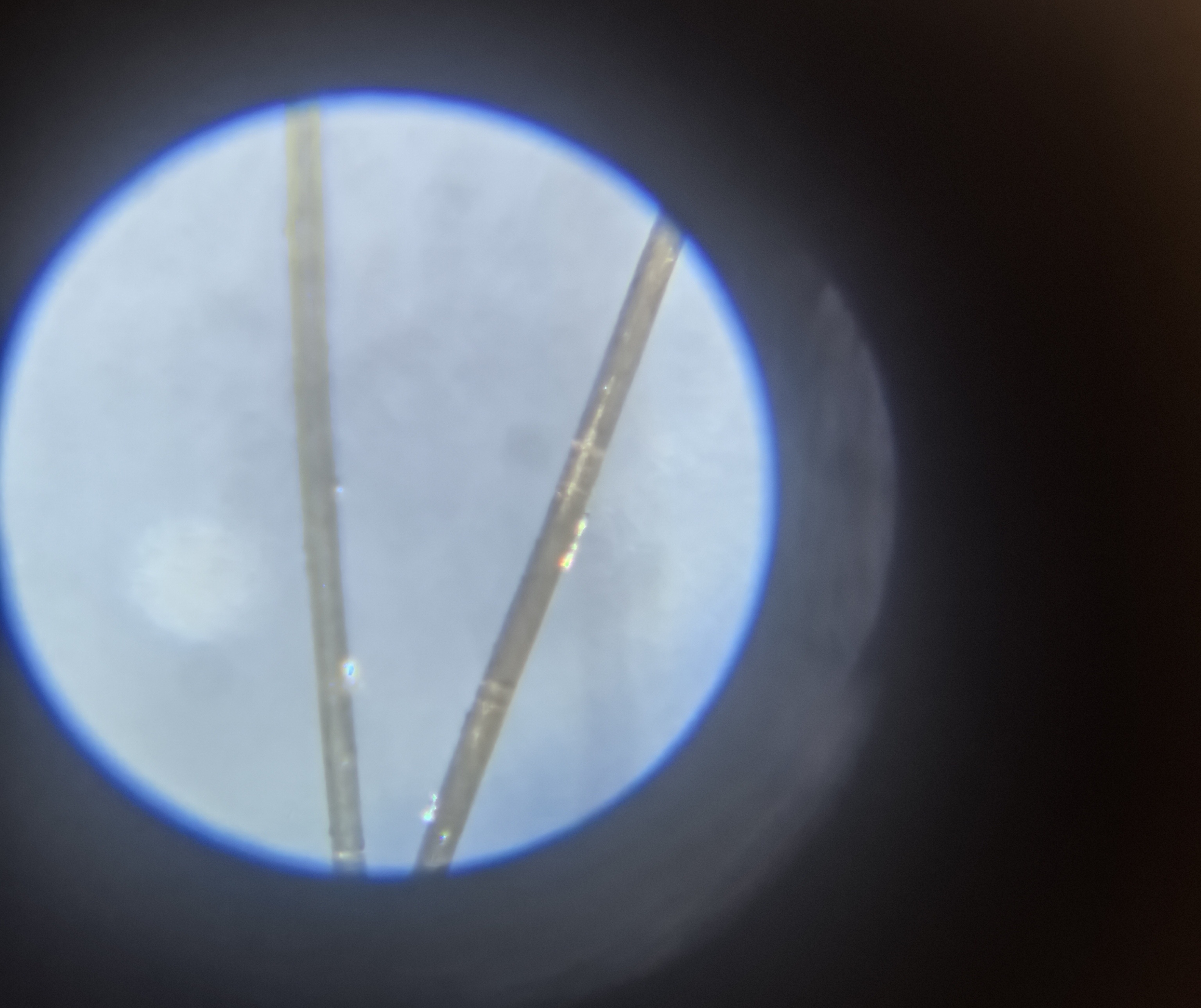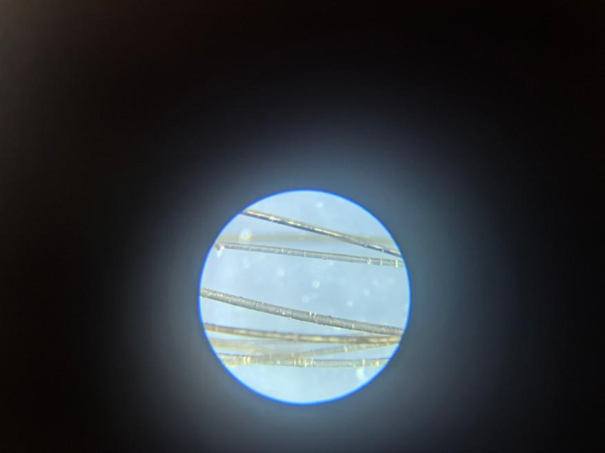 Было интересно увидеть, как выглядит волос с головы. По сравнению с тем, как аналогичный объект выглядел в микроскоп Svbony SM202 (обзор здесь), мне обозреваемых товар понравился не хуже, чем большой его аналог. Из обзора бинокулярного микроскопа Svbony SV605 (обзор здесь), в котором также рассматривал волосы с головы, видно было больше. Стационарные решения проигрывают обозреваемому в компактности и скорости готовности к использованию. Однако в них нет аберраций.