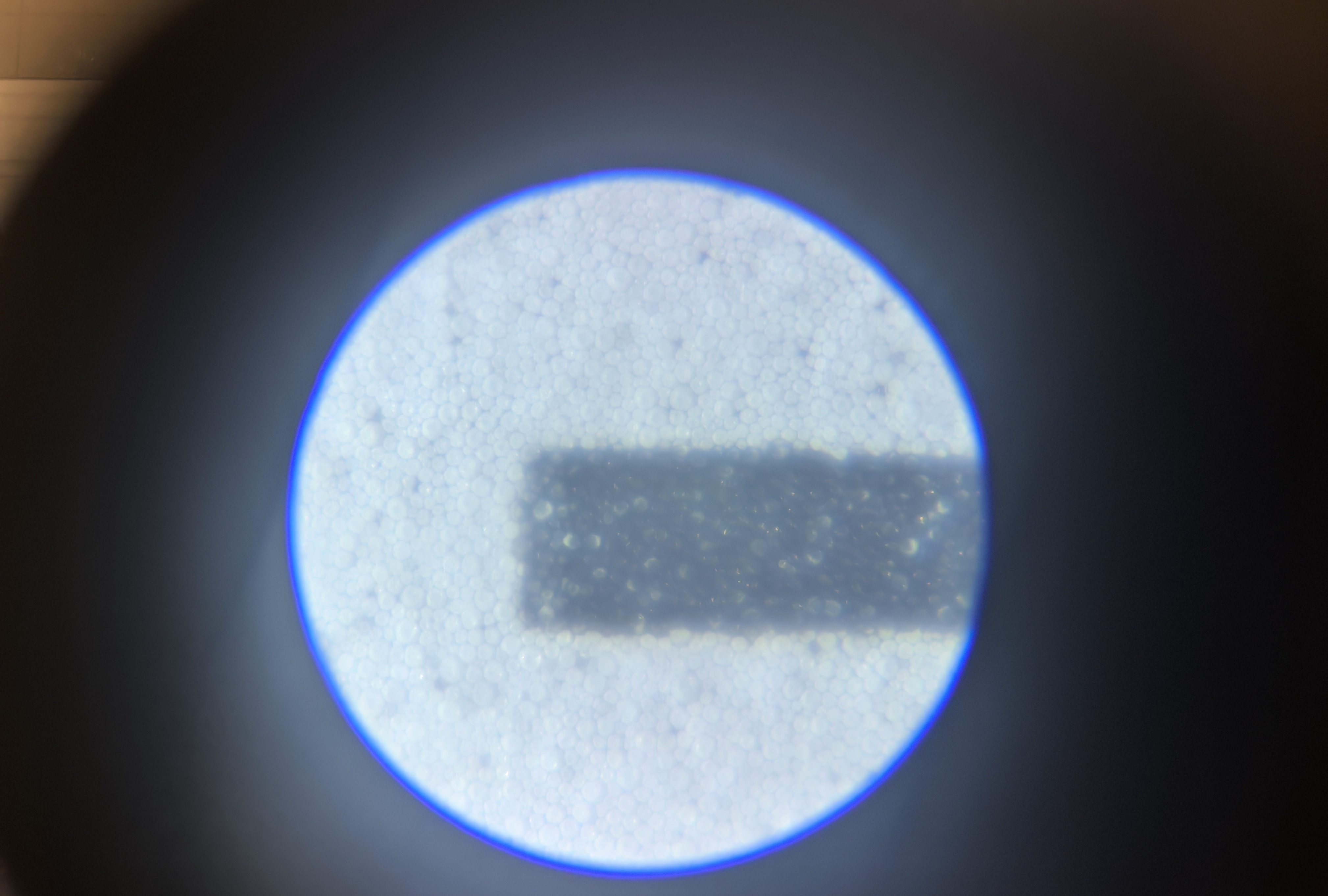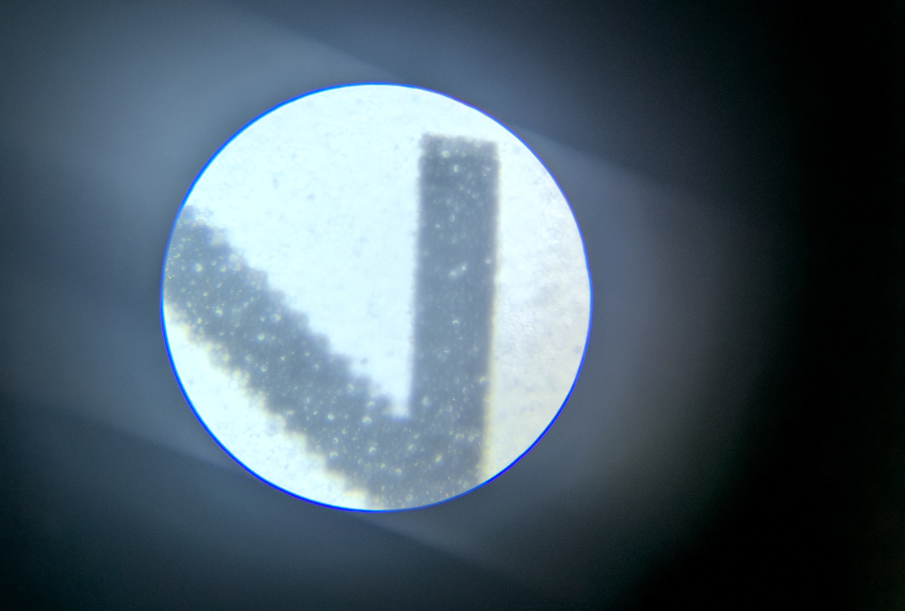 На первом увеличении виден один из четырех квадратов со сторонами. На второй фотографии виден один из четырех квадратов полностью. Получается, поле зрения на максимальном увеличении соответствует заявленному на минимальном (1,9 мм) и даже немного превышает его. Следовательно, можно сделать вывод, что реальное максимальное увеличение превышает 60 крат (минимально заявленное), но много меньше заявленных 120х. В итоге, в Svbony SV603 нет 120х. Оценить минимальное увеличение у меня не получилось, но поле зрение в нем больше 2 мм.