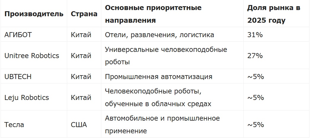 Согласно отчету Counterpoint, доминирующее положение на мировом рынке (73%) занимают пять крупнейших компаний, причем большинство из них — китайские производители. Наиболее значимым участником является AGIBOT, занимающий 31% рынка. Этот успех обусловлен производством свыше 5 тысяч единиц продукции и их активным внедрением в гостиничную сферу, индустрию развлечений и процессы промышленной логистики. Unitree Robotics находится на втором месте с 27% рыночной доли, что обусловлено их бюджетными решениями и быстрой реализацией проектов. Компании UBTECH, Leju Robotics и Tesla обладают приблизительно 5% рынка каждая. Прогнозируется, что Tesla укрепит свои позиции по мере увеличения объемов производства Optimus.