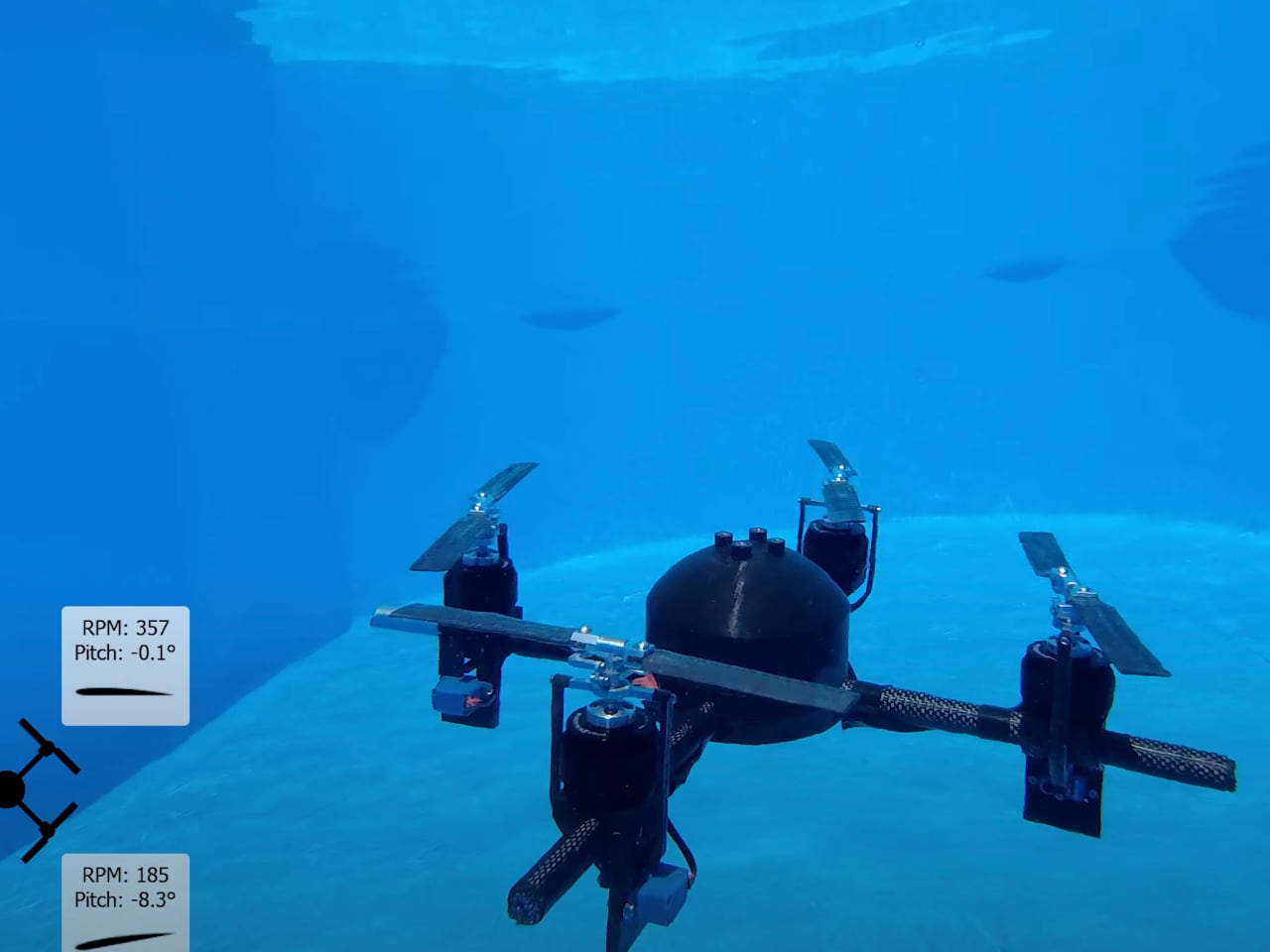При работе в воздухе лопасти пропеллера устанавливаются под более крутым углом для создания достаточной подъемной силы. При погружении в воду механизм автоматически уменьшает угол наклона лопастей, адаптируясь к повышенной плотности среды и сопротивлению. Это техническое решение позволяет дрону эффективно функционировать в обеих средах без необходимости ручной перенастройки или использования отдельных двигательных систем.
