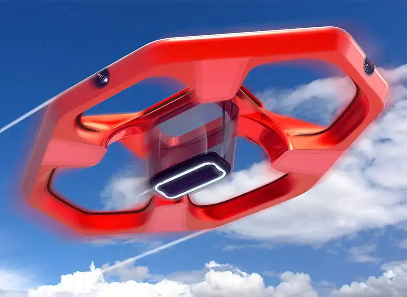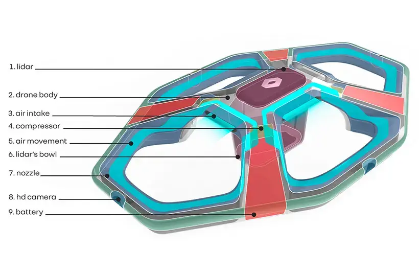 Конструкция дрона использует аэродинамический принцип работы без традиционных лопастей и вентиляторов. Подъемная сила создается за счет зон низкого давления, что обеспечивает бесшумную работу устройства. Внешний дизайн выполнен в ромбовидной форме, характерной для бренда Renault.
