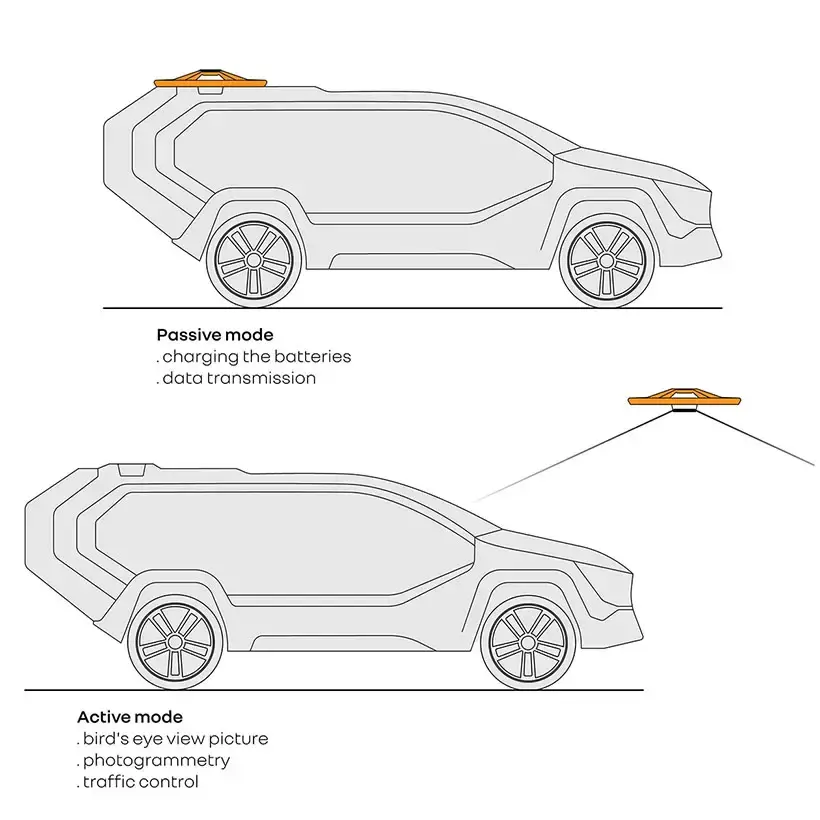 Дрон оснащен системой искусственного интеллекта, которая позволяет ему летать на расстояние до 5 километров впереди транспортного средства. Во время полета устройство сканирует местность, собирает данные о дорожной обстановке и потенциальных опасностях. После завершения разведки дрон возвращается и передает собранную информацию бортовому ИИ основного транспорта, который корректирует маршрут в реальном времени.