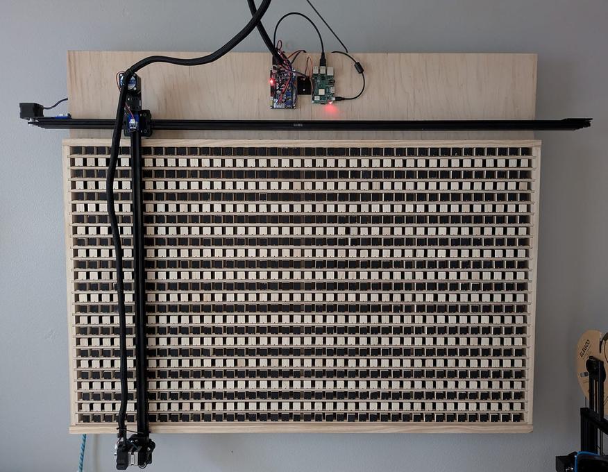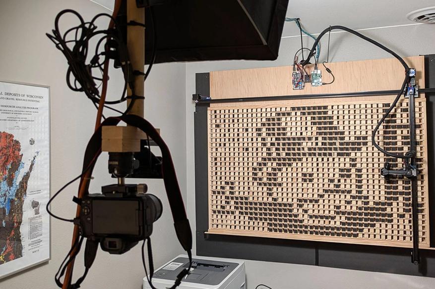 Американский инженер-энтузиаст Бен Холмен представил результат шестилетней работы над Kilopixel — механическим дисплеем, состоящим из 1000 деревянных «пикселей». Каждый элемент представляет собой кубический блок размером 40x25 мм, установленный на металлические проволоки и способный вращаться на 90 градусов. Изображение формируется за счет последовательного поворота пикселей механической рукой, управляемой через Raspberry Pi и CNC-контроллер.
