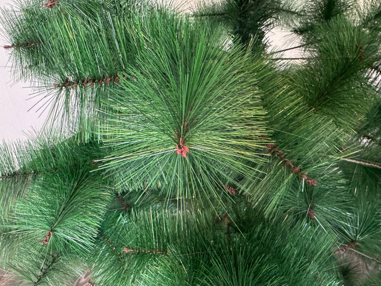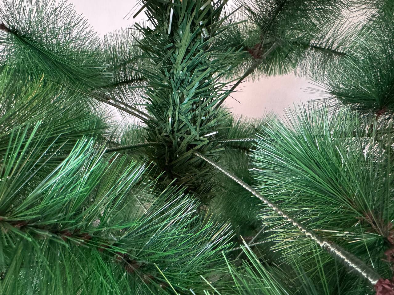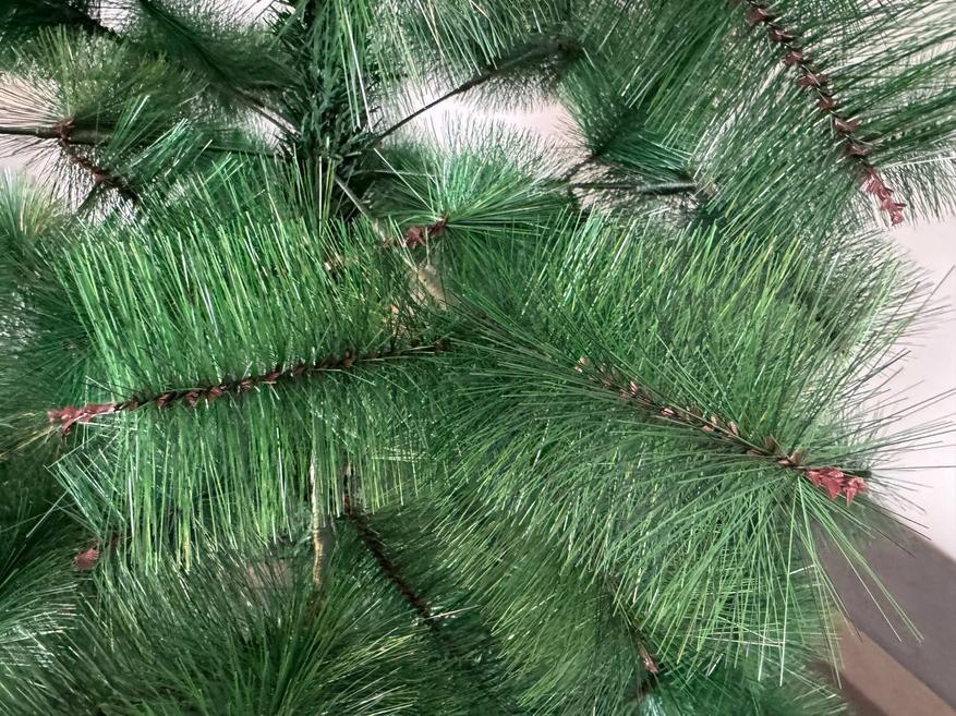 Сама ёлка после распушивания выглядит очень достойно. Да, из коробки она кажется редкой и «жиденькой», но это обманчивое впечатление. Когда все ветки заняли своё положение, она стала довольно пушистой и визуально объёмной. Высота действительно близка к заявленным 210 см, особенно если вытянуть макушку. Плюс туда спокойно можно поставить звезду или пику. На каждой ветке находится по 5-6 ответвлений с пушистыми иголками. Если все эти ответвления правильно расправить, то можно получить достаточно пушистую елку без проплешин.