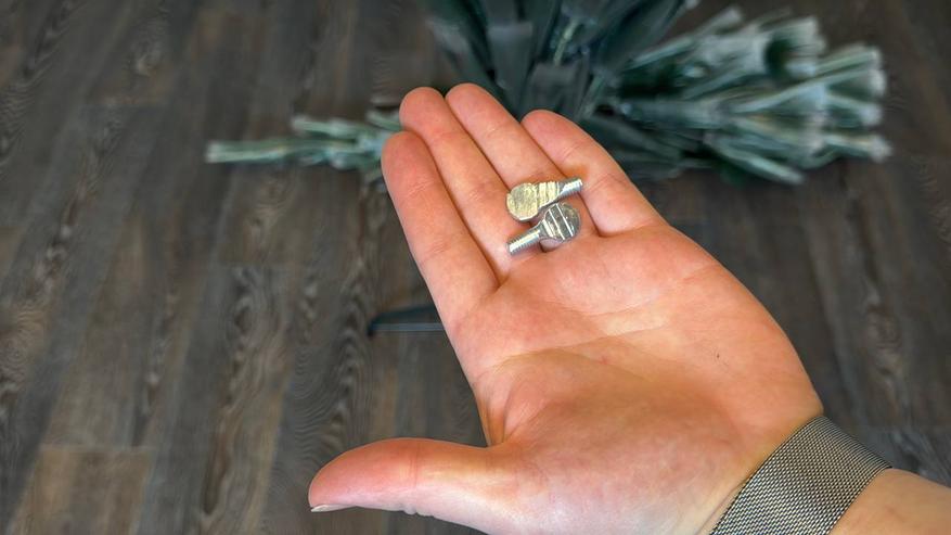 Подставка оказалась металлической, а не пластиковой — это большой плюс. Конструкция простая и понятная, крепления надёжные. Нижняя часть ствола крепится к подставке двумя болтиками, которые закручиваются вручную. Правда, на отверстиях металлической подставки края были слегка острые, так что пришлось немного пройтись наждачкой. Ничего критичного, но момент, на который стоит обратить внимание. В остальном все стандартно. Елка состоит из трех частей, которые вставляются друг в друга.