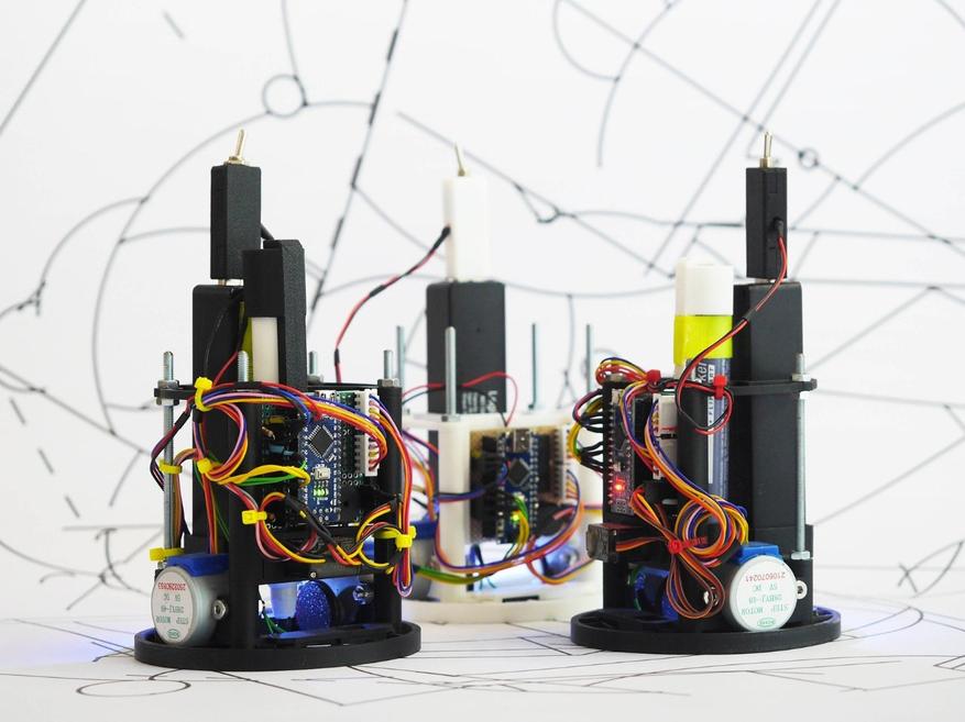 Никлас Рой представил проект «Фабрика роботов», в рамках которого компактные роботы, оснащенные шариковыми ручками, создают сложные художественные композиции. Устройства, собранные из деталей, напечатанных на 3D-принтере, оснащены двумя шаговыми двигателями с уплотнительными кольцами вместо колес и платой Arduino Nano в качестве процессора.
