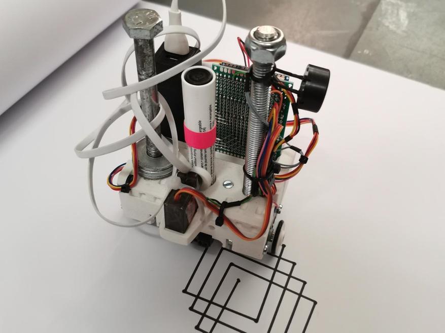 Роботы перемещаются по поверхности, оставляя следы ручкой, закрепленной в центре конструкции. Последние модификации позволили увеличить скорость вращения за счет приближения колес к ручке, хотя это иногда приводит к небольшой потере ориентации. Несмотря на отсутствие внешних ориентиров, устройства сохраняют позиционирование благодаря базовым тригонометрическим расчетам.