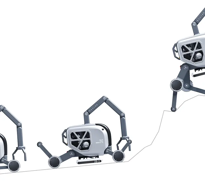 Робот оснащен колесной базой для перемещения по ровным поверхностям и механизмом трансформации в шагающий режим при обнаружении препятствий. Система LiDAR непрерывно сканирует окружающую среду, что позволяет устройству автоматически выбирать оптимальный способ передвижения в зависимости от рельефа.