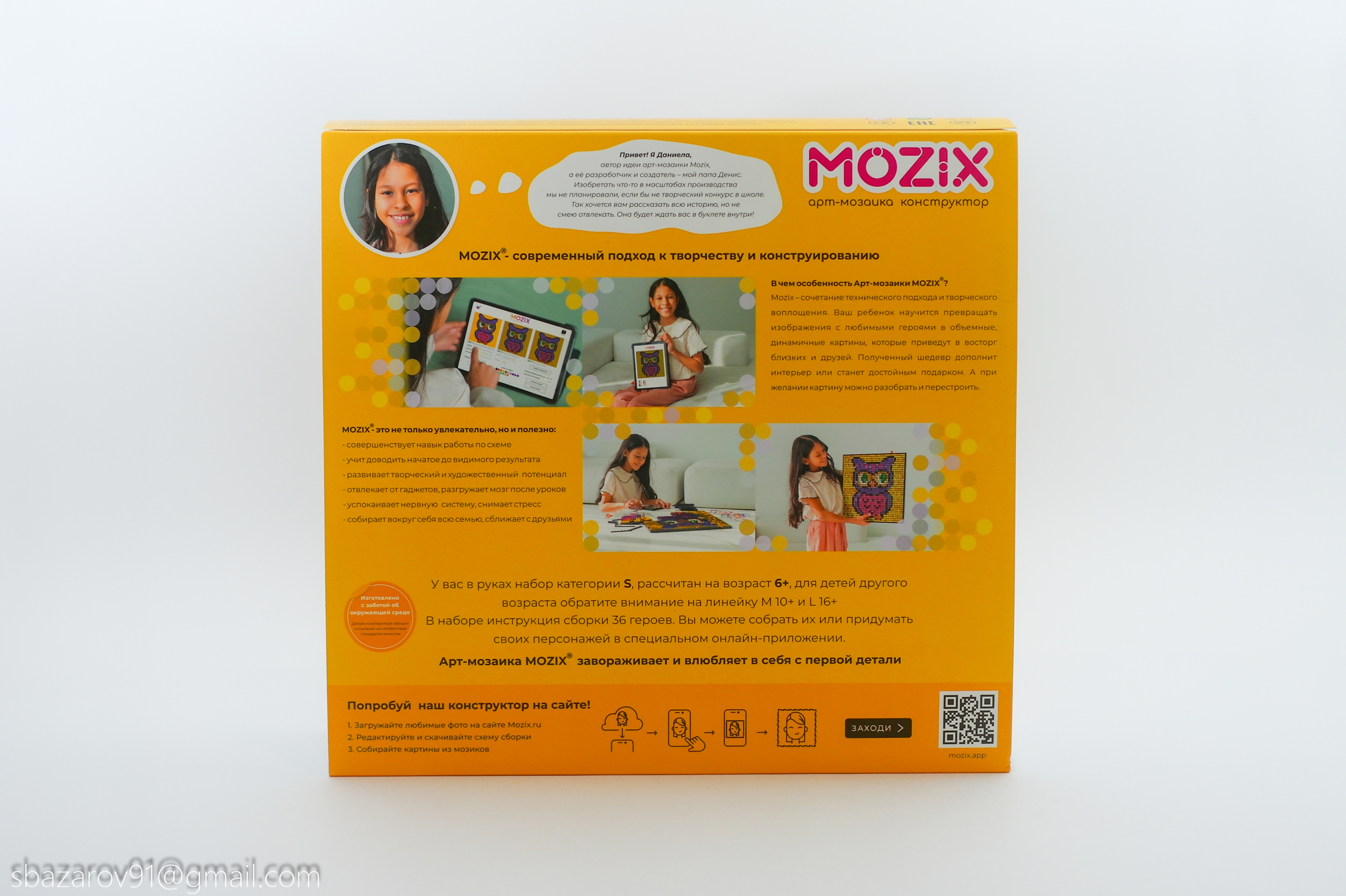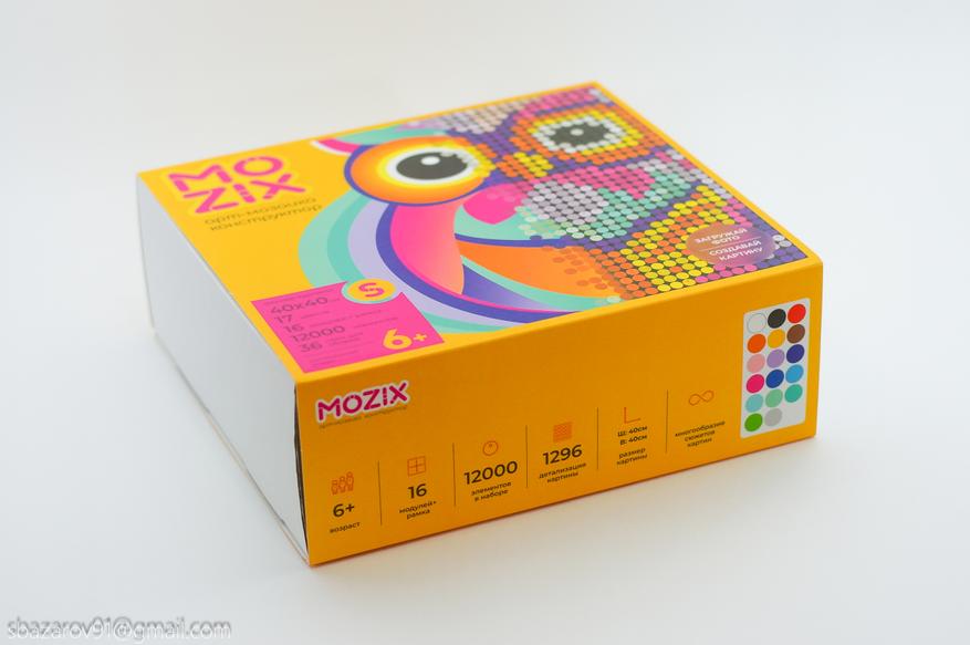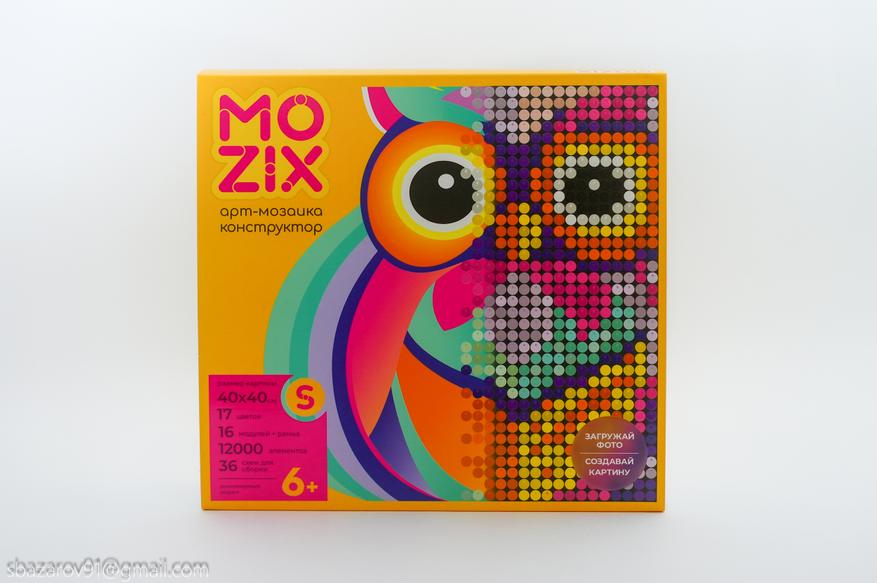 Приобретая арт-мозаику-конструктор Mozix (Мозикс), мы получаем увесистую упаковку с ярким дизайном. Главная идея этого набора — современный подход к творчеству и конструированию, близкий к конструкторам Mozabrick (Мозабрик), но при этом находящийся в своем уникальном измерении. Конструктор Мозикс предлагает пользователям возможность создавать как собственные изображения, так и использовать готовые решения, опираясь на «мозики» — плоские декорации круглой формы с отверстиями.