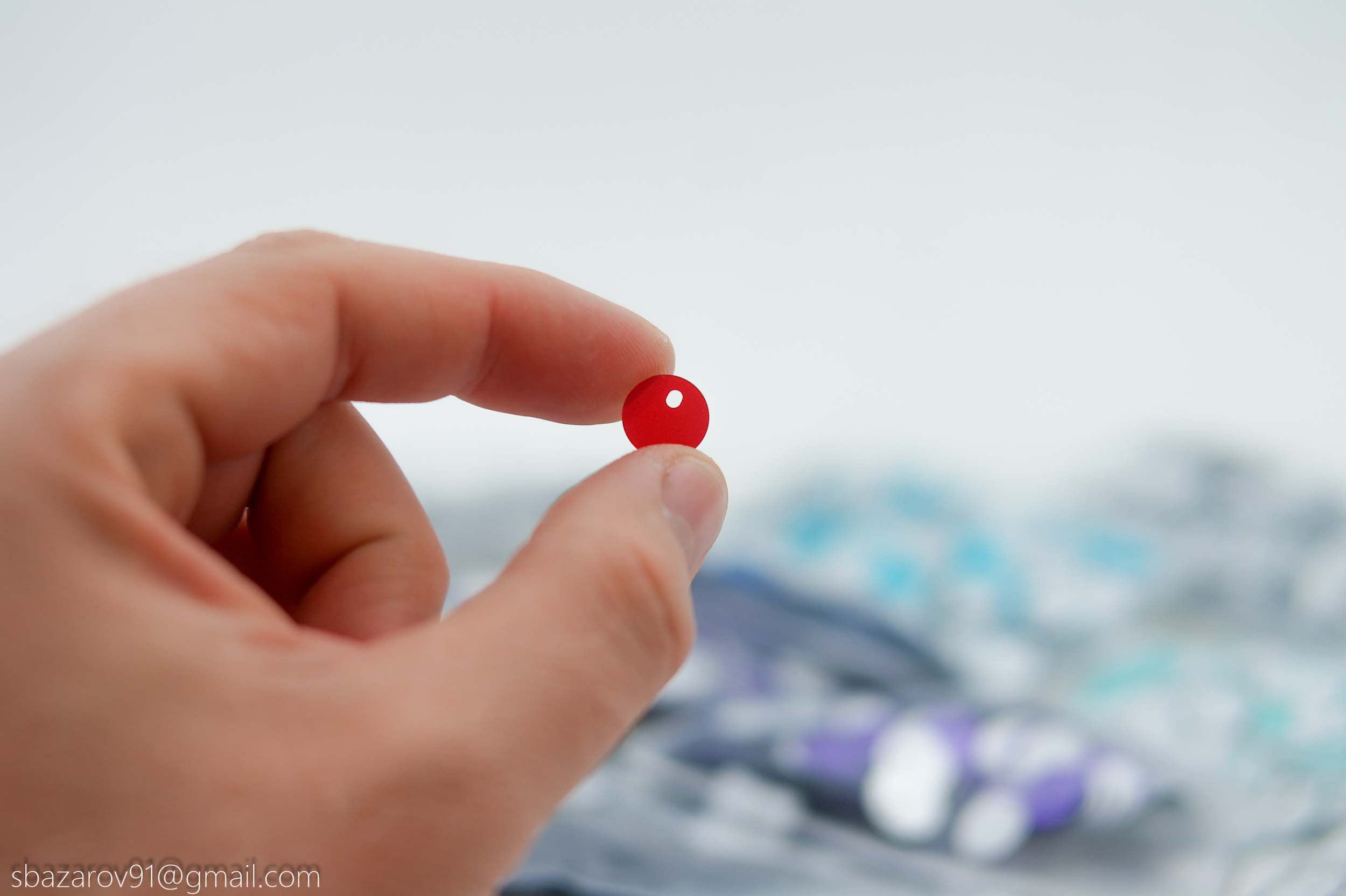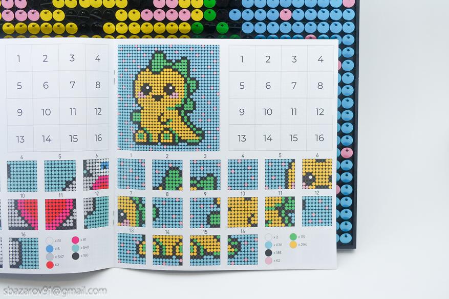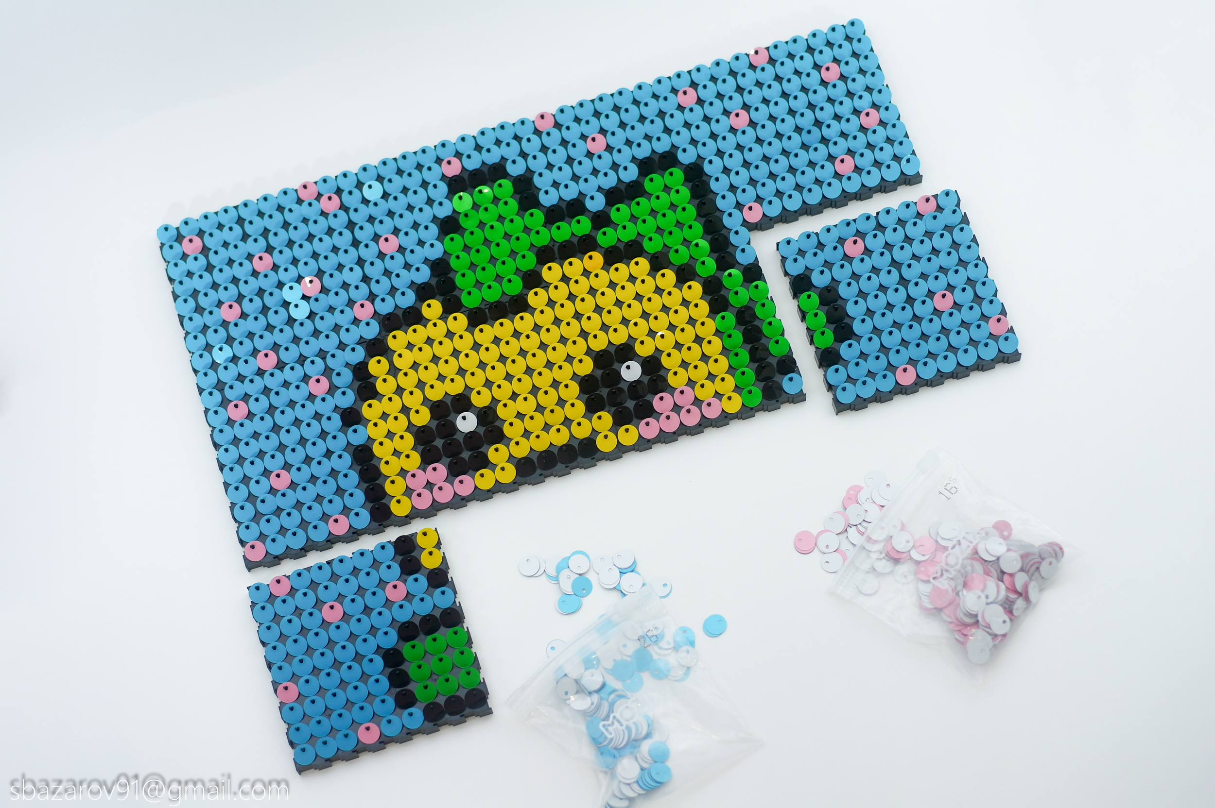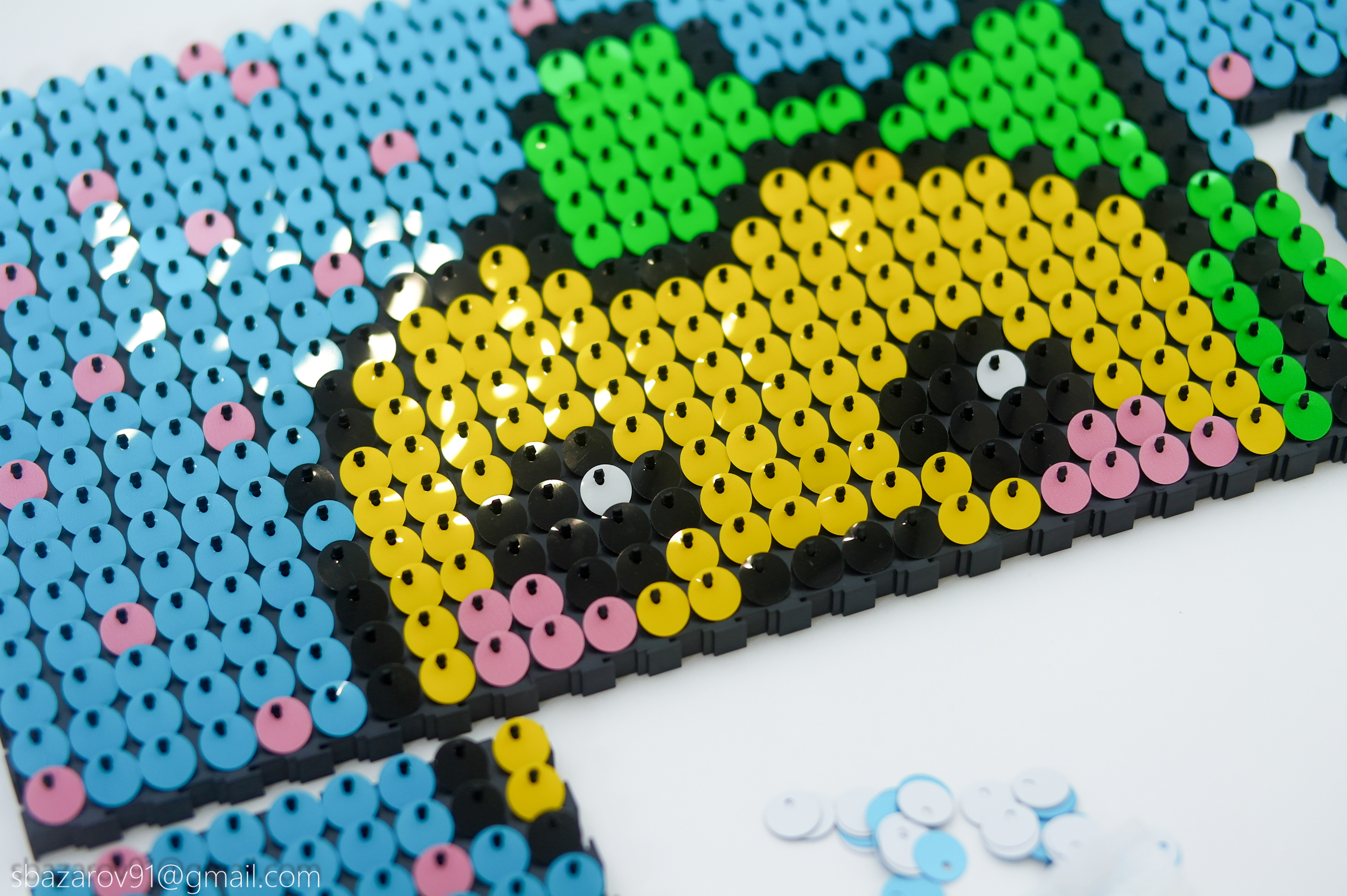 Вернемся к дестким иллюстрациям. Для нашей сборки мы выбрали рисунок динозавра, состоящий из 6 цветов: белого (2), голубого (638), черного (185), розового (62), зеленого (115) и желтого (294). Цифры рядом с цветами указывают количество необходимых пайеток. Мы разделили полотно на квадраты и, устроившись за просмотром фильма, приступили к сборке. Несмотря на небольшие размеры, нам понадобилось установить 1296 пайеток, что заняло целых 2 часа с двумя сборщиками.