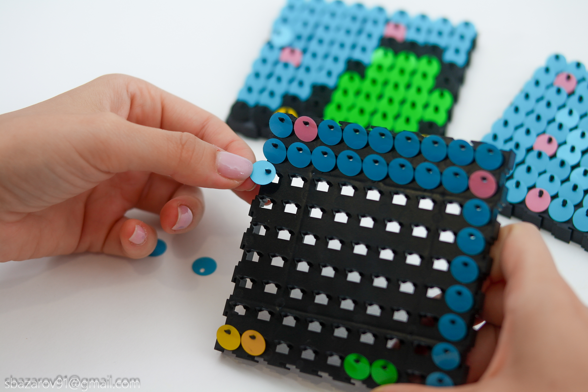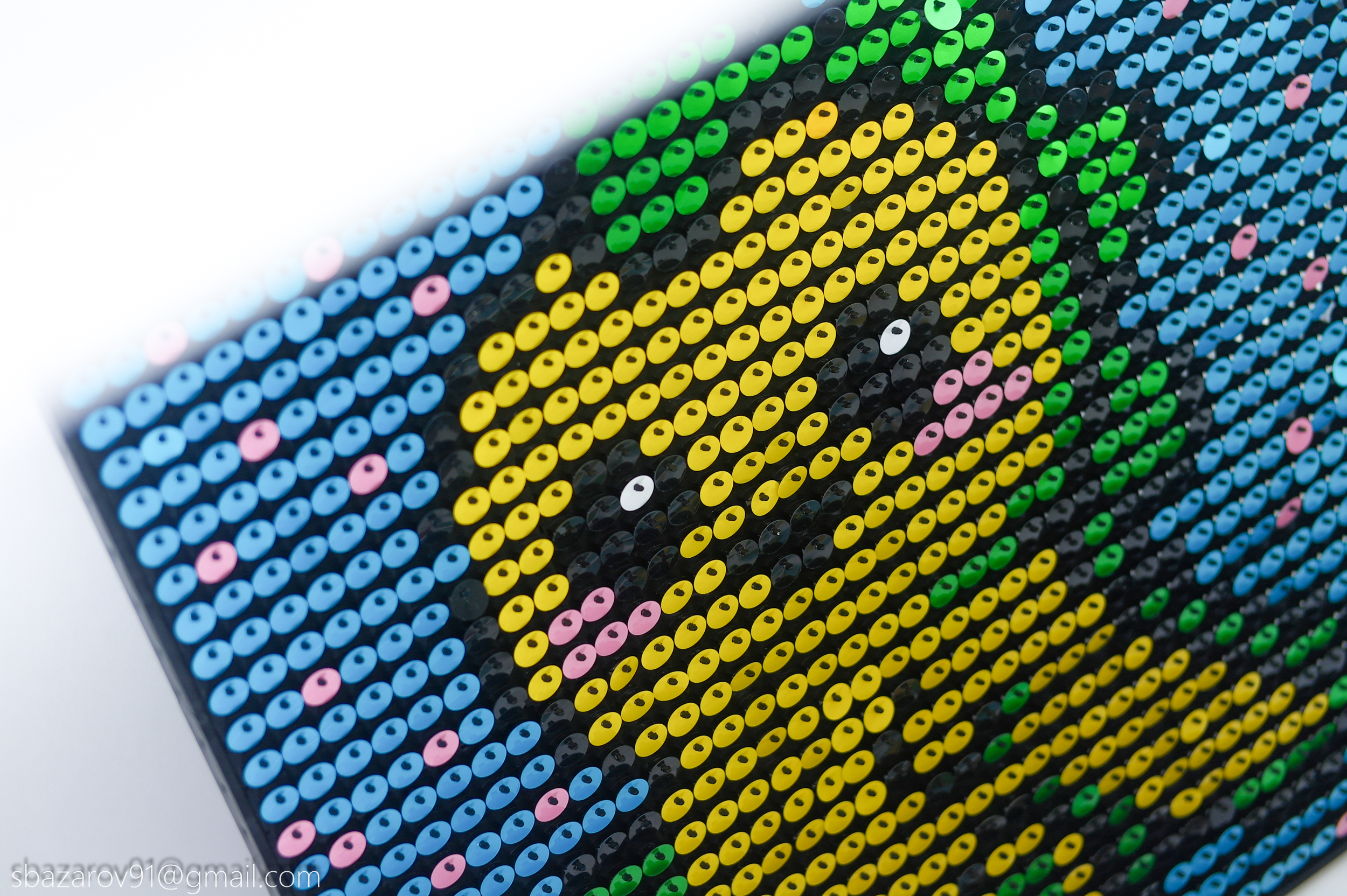 Сборка оказалась увлекательной: сначала мы делили квадраты между собой, а затем собирали их по отдельности. Финалом стало объединение всех частей в одно целое. По началу может показаться, что крепление пайеток — это сложный процесс, но, привыкнув, даже у меня не возникло трудностей. После сборки 8 квадратов начала формироваться общая картина.