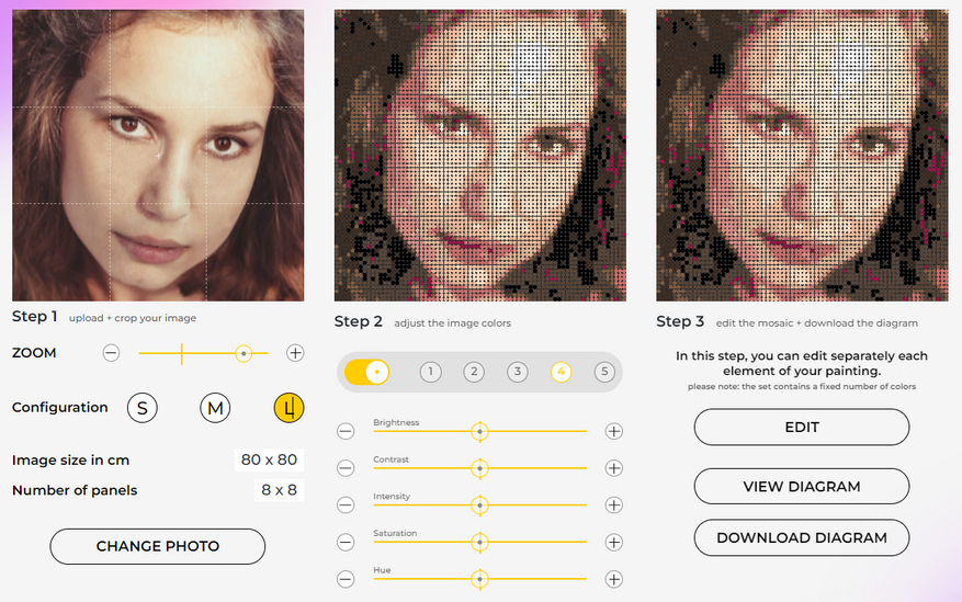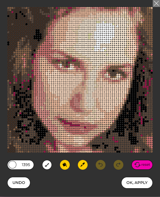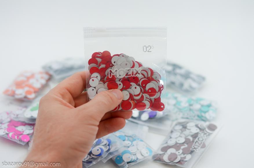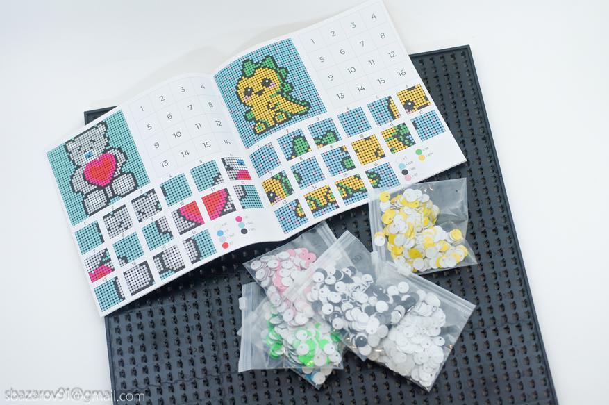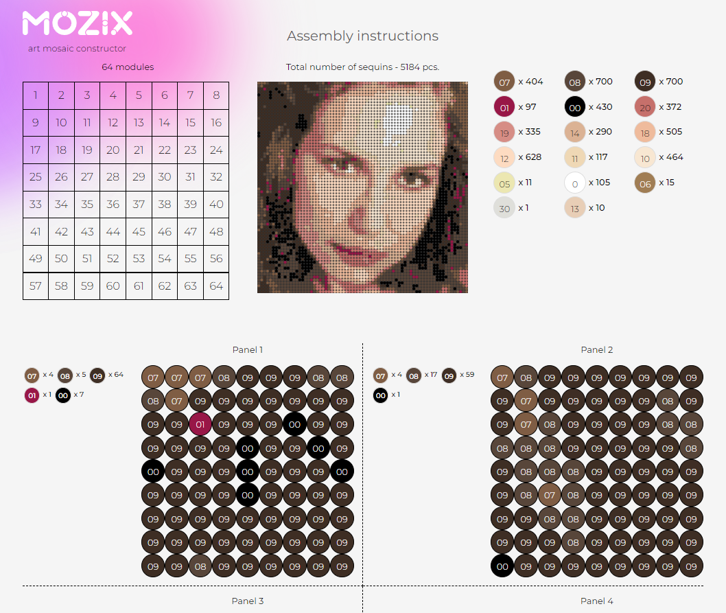 - Получение готовой инструкции по сборке. Инструкция содержит подробное описание процесса и количество необходимых пайеток. При сборке портрета размера L потребуется 5184 элемента, размещённых на 64 квадратиках основания.