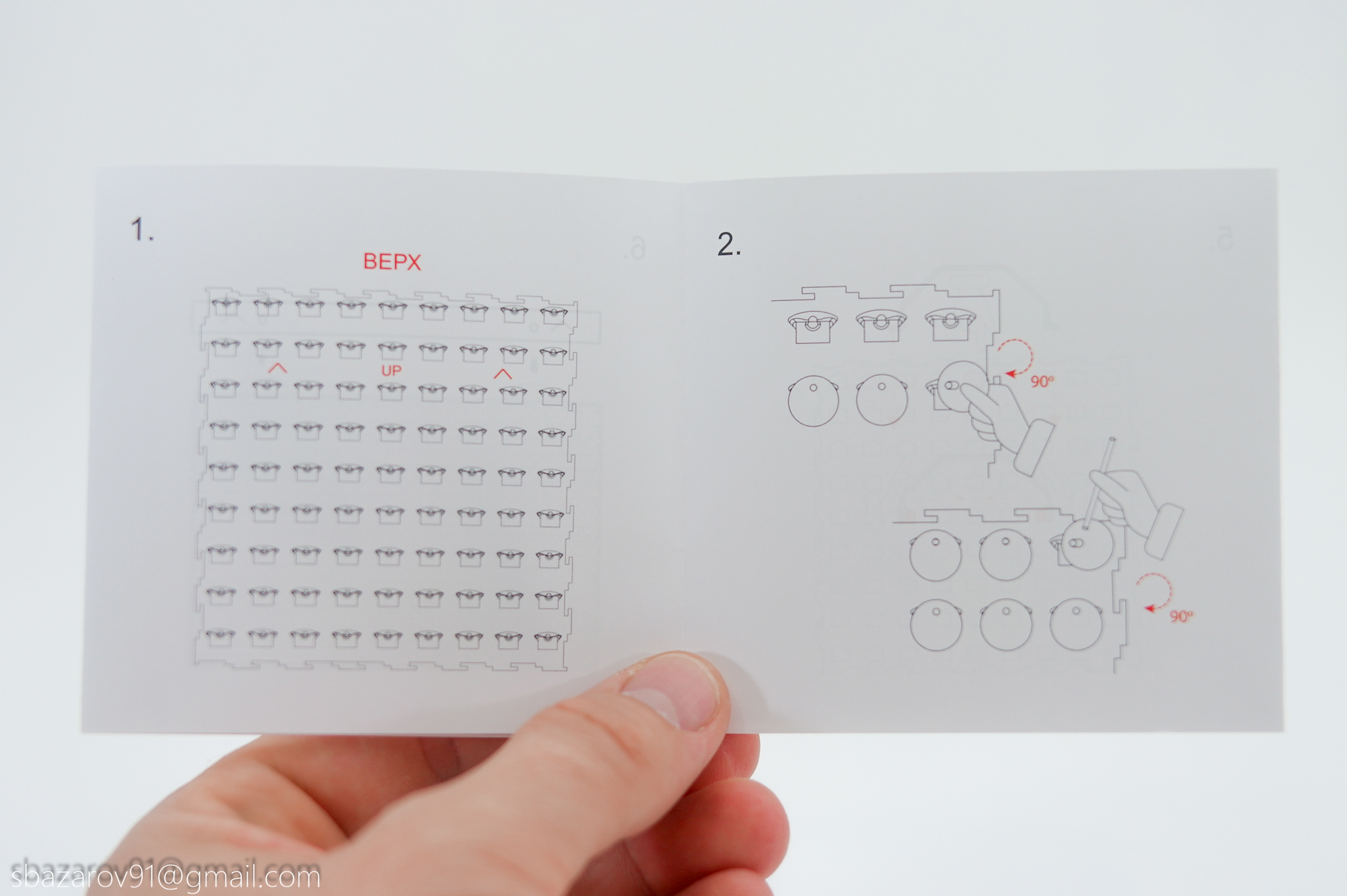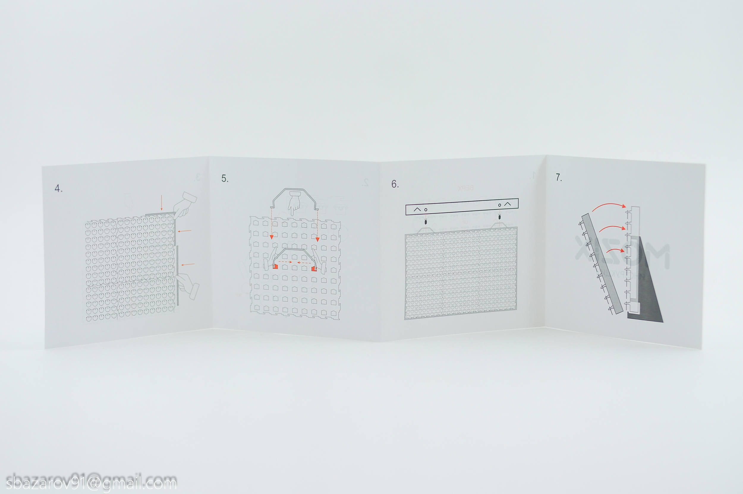 В комплекте присутствует краткая инструкция, которая объясняет не только процесс работы с пайетками, но и монтаж настольной подставки и подвесного крепежа. Настольная подставка состоит из двух прозрачных оргстеклянных форм, на которые устанавливается собранная картина, позволяя разместить ее на комоде, прикроватной тумбочке или стенке.