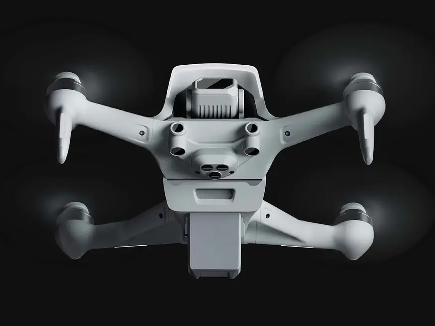 В основе конструкции лежит модульный принцип «структурного наложения», характерный для архитектуры DJI. Основные компоненты дрона расположены в виде вертикально организованных блоков. В передней части находится модуль камеры и стабилизатора, за ним следует блок управления полётом и система охлаждения, размещённые под вытянутой тёмной панелью. В задней части установлен съёмный аккумуляторный блок. Такая компоновка отличается от стандартных FPV-дронов с открытой рамой, где компоненты крепятся к карбоновому каркасу.