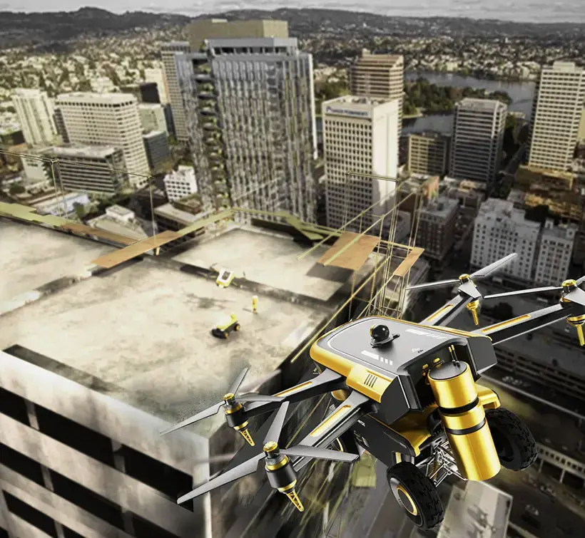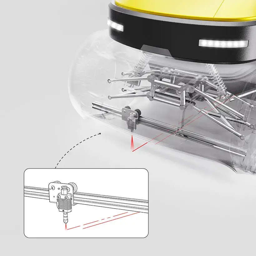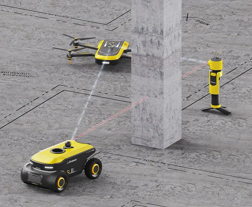 Система состоит из дрона, компактного робота-проектировщика и тахеометра. Дрон доставляет оборудование непосредственно на строительную площадку, после чего робот самостоятельно выполняет калибровку и приступает к разметке линий без участия человека.